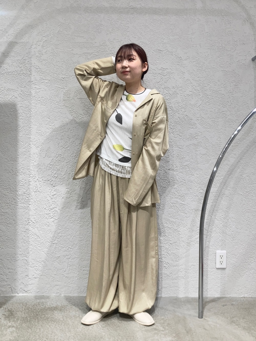 サテンシャツのバルーンパンツは同素材なので、セットアップで着ることができます!