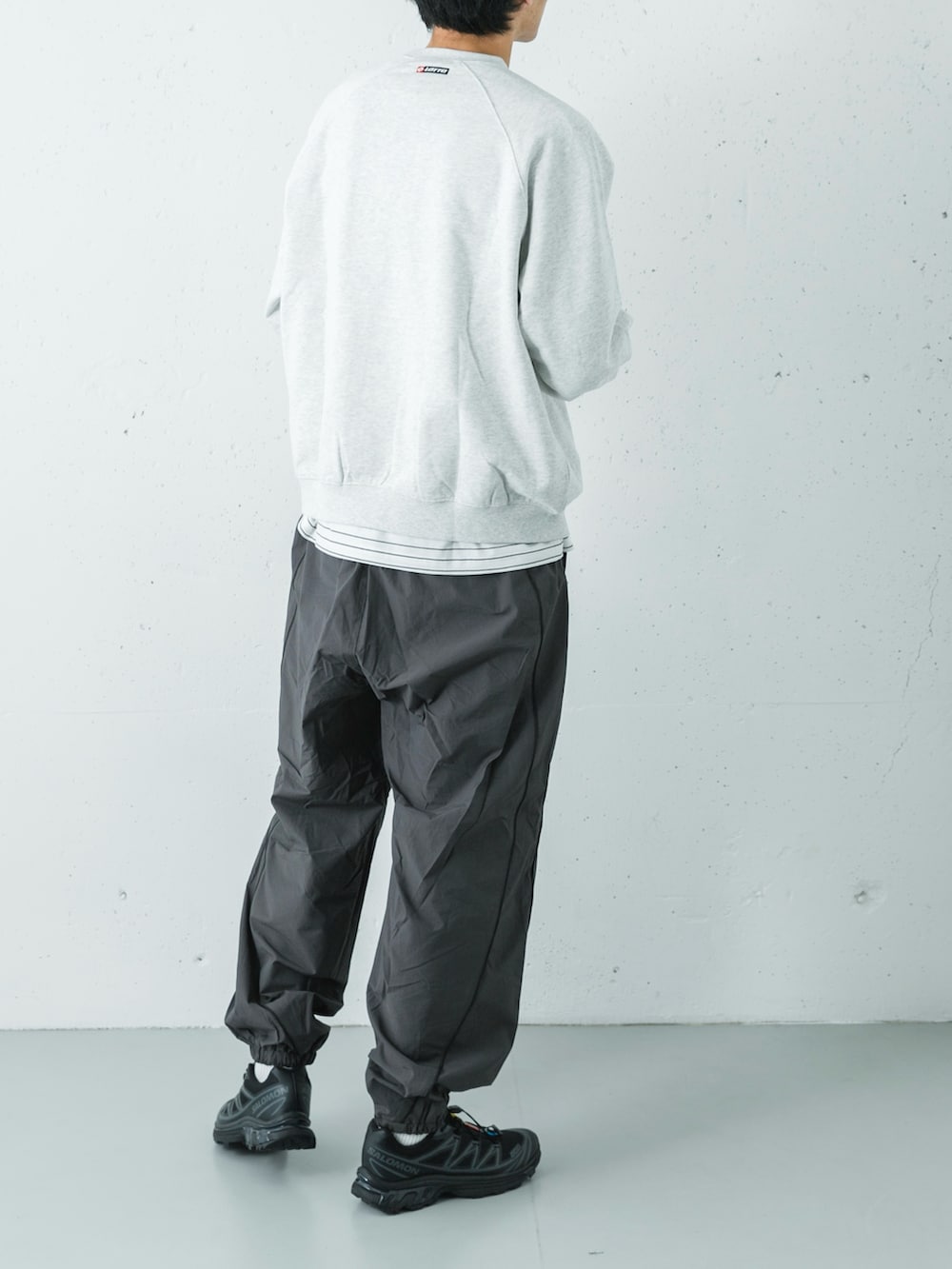トップスのスウェットとボトムスのナイロンパンツ。上下をグレーのワントーンで揃えながら、素材の質感を変えることでメリハリを生み出した、高度なスポーツミックススタイルです。