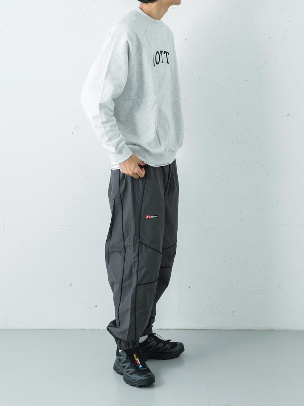トップスは、クラシックなアーチロゴが映える王道のスウェット。この柔らかなコットンの風合いに対し、ボトムスにはドライで光沢のあるライン入りナイロンパンツをセレクトしました。「マットなスウェット」と「硬質なナイロン」。この異素材のコントラストが、部屋着に見えがちなグレーの上下を、構築的でモダンな街着へと昇華させています。