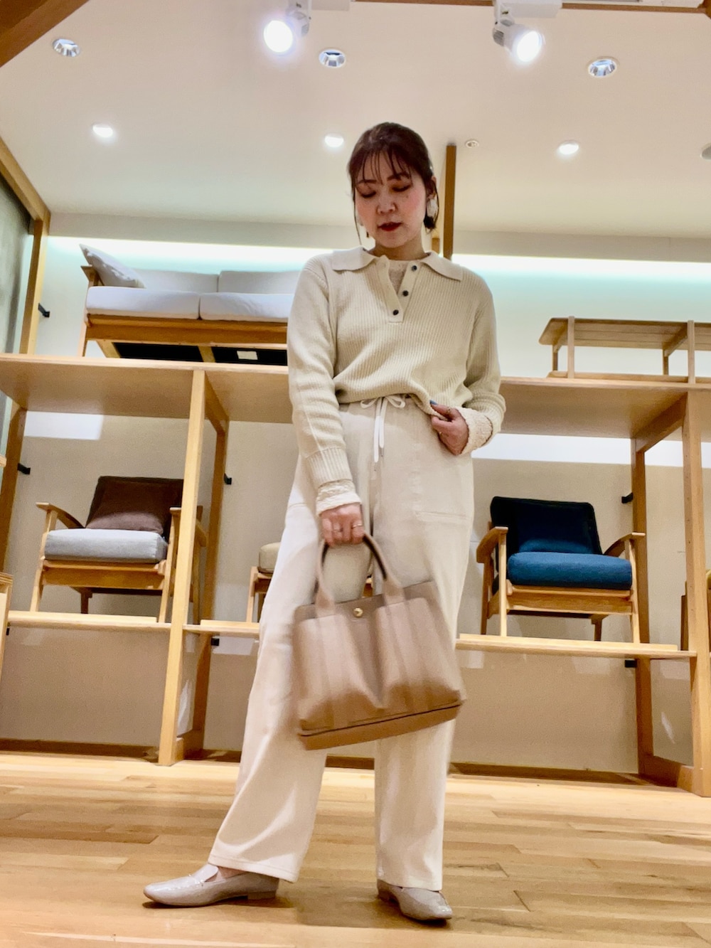 トップスは、襟付きニットで旬なアイテムで、立体的な異素材のポコポコプルオーバーを合わせました‼︎