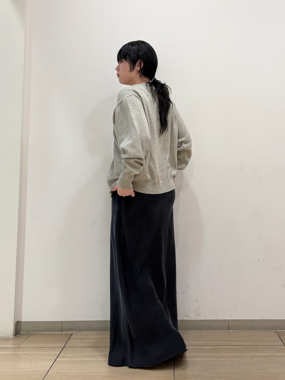 カーディガンはVネックで首元がすっきり見えするアイテムです!今から春まで活躍してくれそうです✨スカートもさらっとした履き心地と綺麗なシルエットでオススメです✨