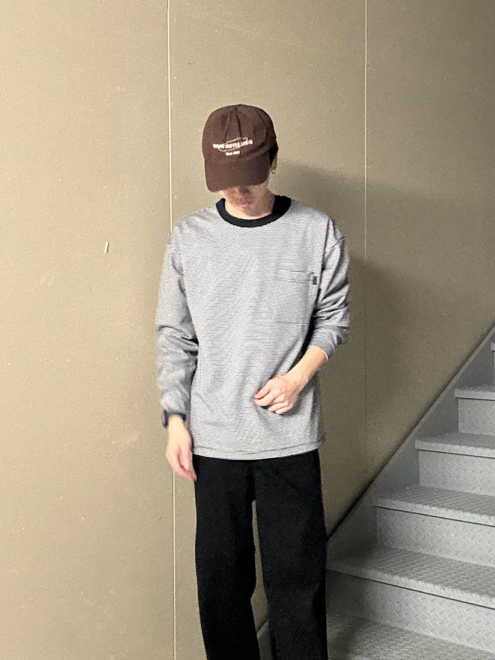 ほぼモノトーンでまとめて、キャップのブラウンがさりげない差し色。