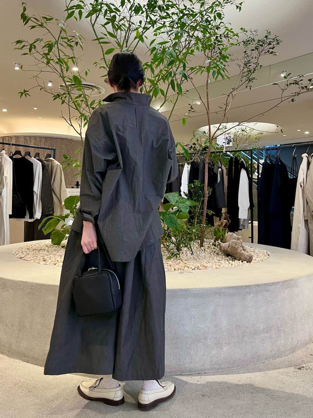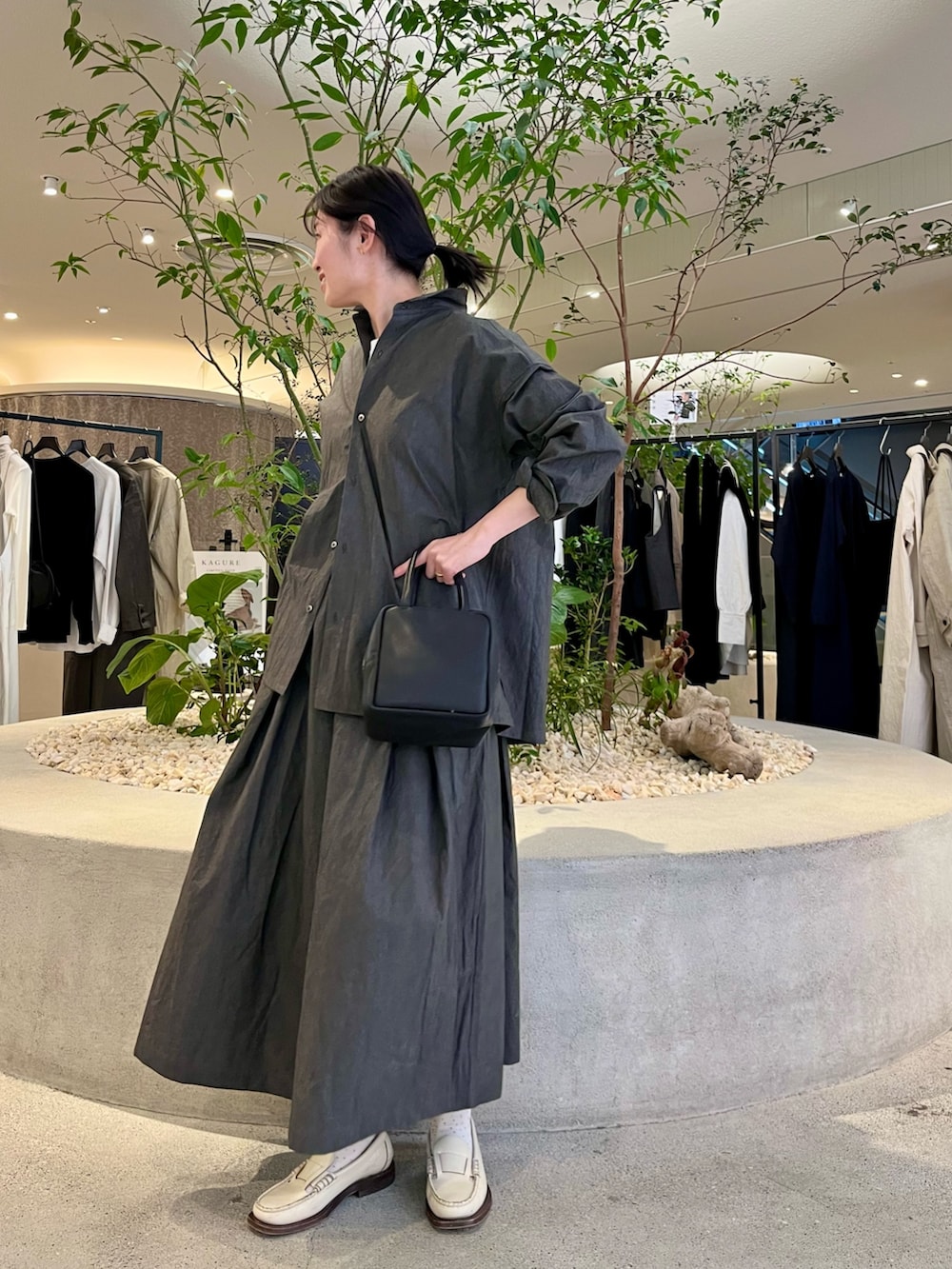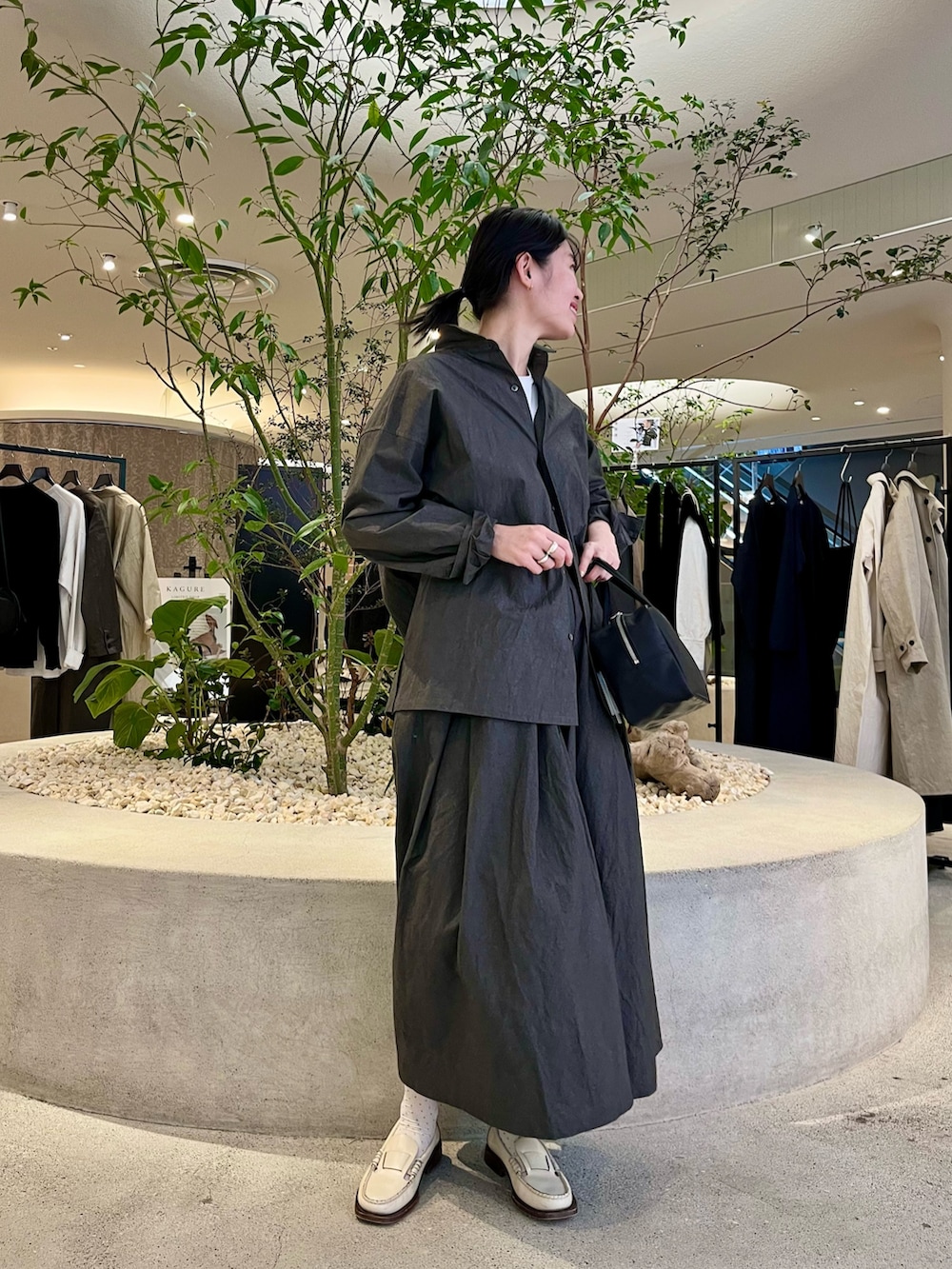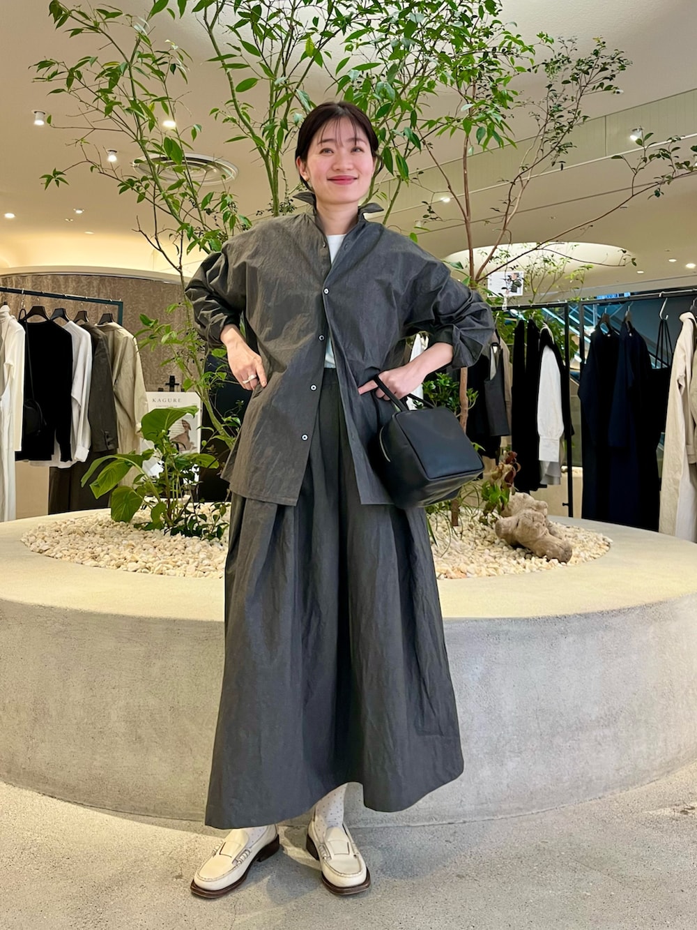 程よいハリのあるセットアップで、リラックス感のある着心地です。チャコールグレーの落ち着いた色味が大人っぽく、一枚で雰囲気の出るアイテム。足元は白を合わせて軽さを出し、抜け感のあるバランスにしました。セットでもそれぞれでも着回しを楽しんでいただけます。