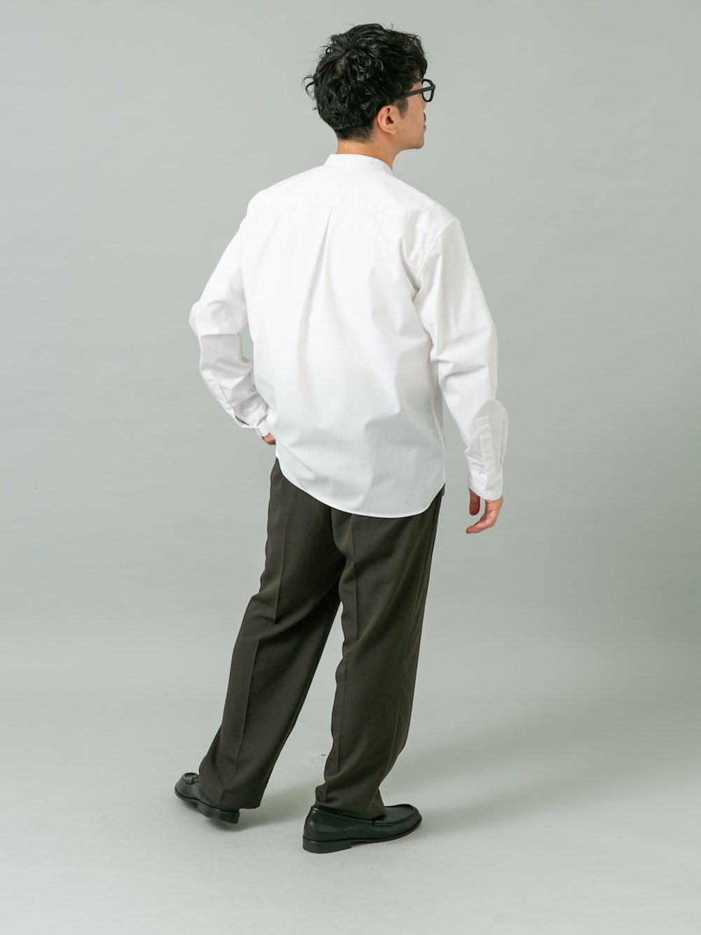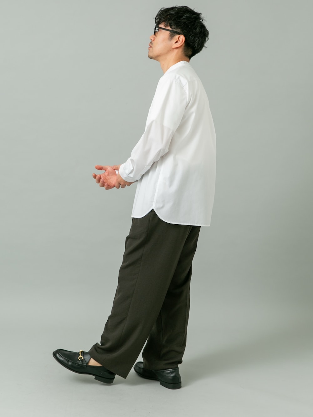 リラックス感のあるブロードシャツに同じくリラックス感のあるスラックスを合わせた休日にオススメなきれいめコーデ。