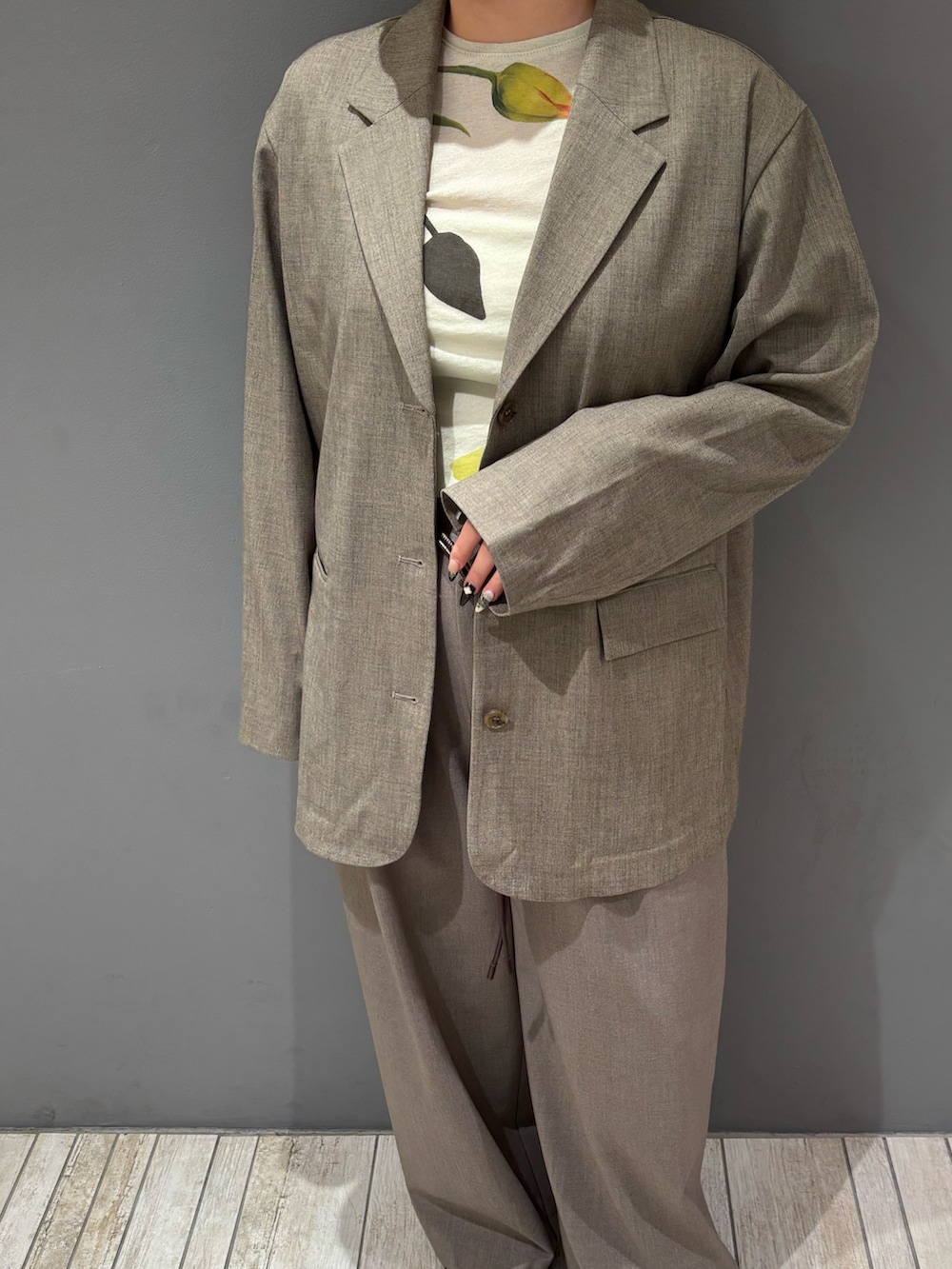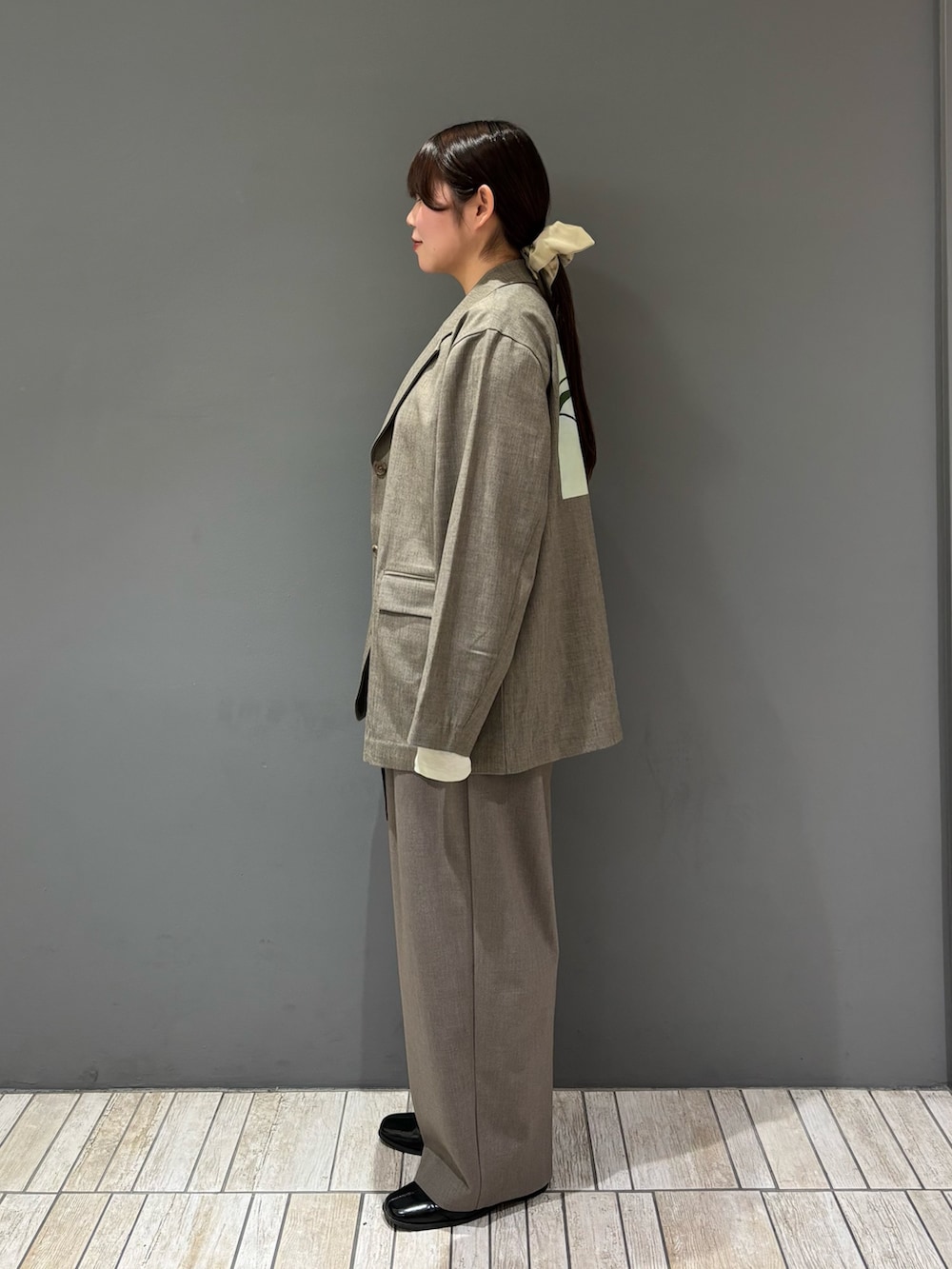 ・シアートップスだけだと上半身の厚みが目立つのでパンツに似たジャケットを合わせて体型カバー&セットアップ風に.ᐟ.ᐟ.ᐟ