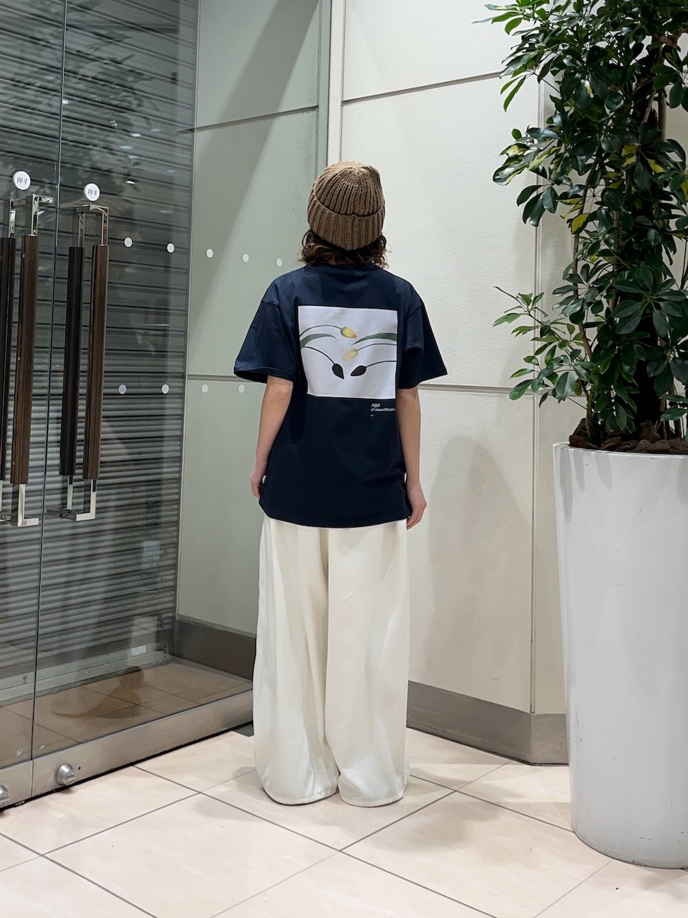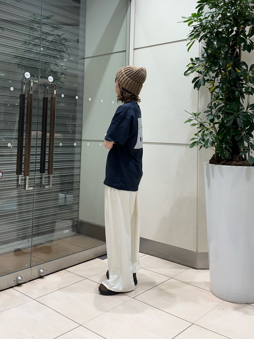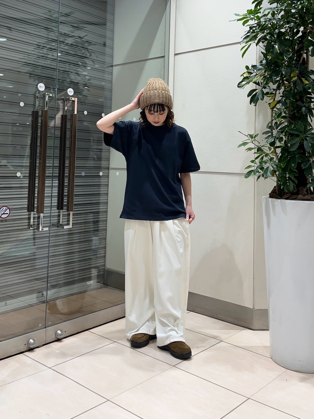 ニット帽とゆったりとしたTシャツでメンズっぽさもありつつ、ホワイトのパンツでキレイめさも出しました!