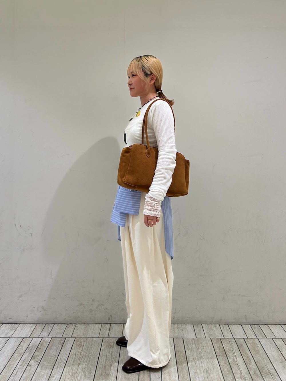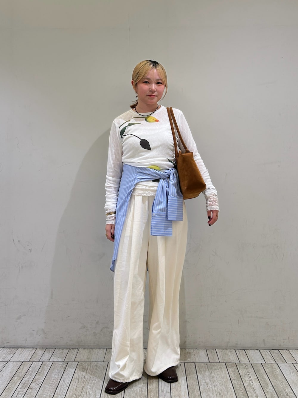 オールホワイトで締まりがなかったので、ブルーのシャツを腰巻きしてウエストマークを👍