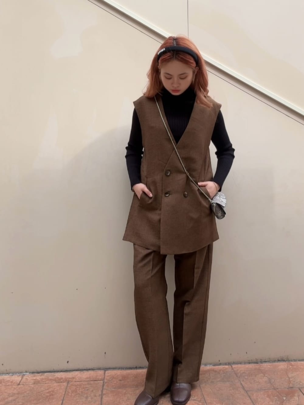 ジレとパンツのセットアップにタートルネックを合わせ、女性らしい柔らかさをプラス。