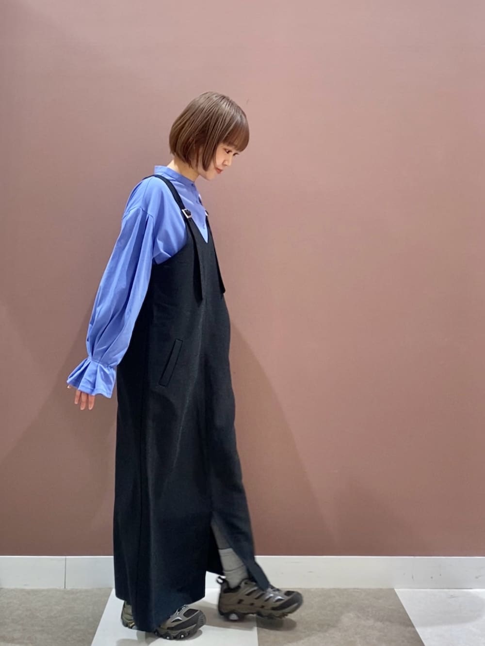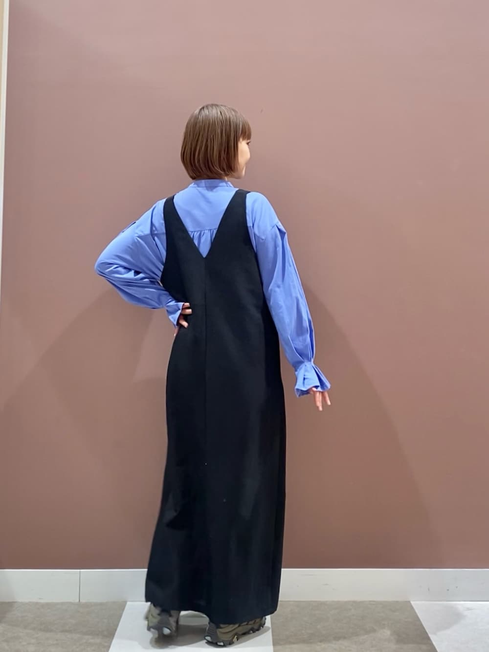 鮮やかなブルーのシャツにジャンスカを合わせたスタイルです!