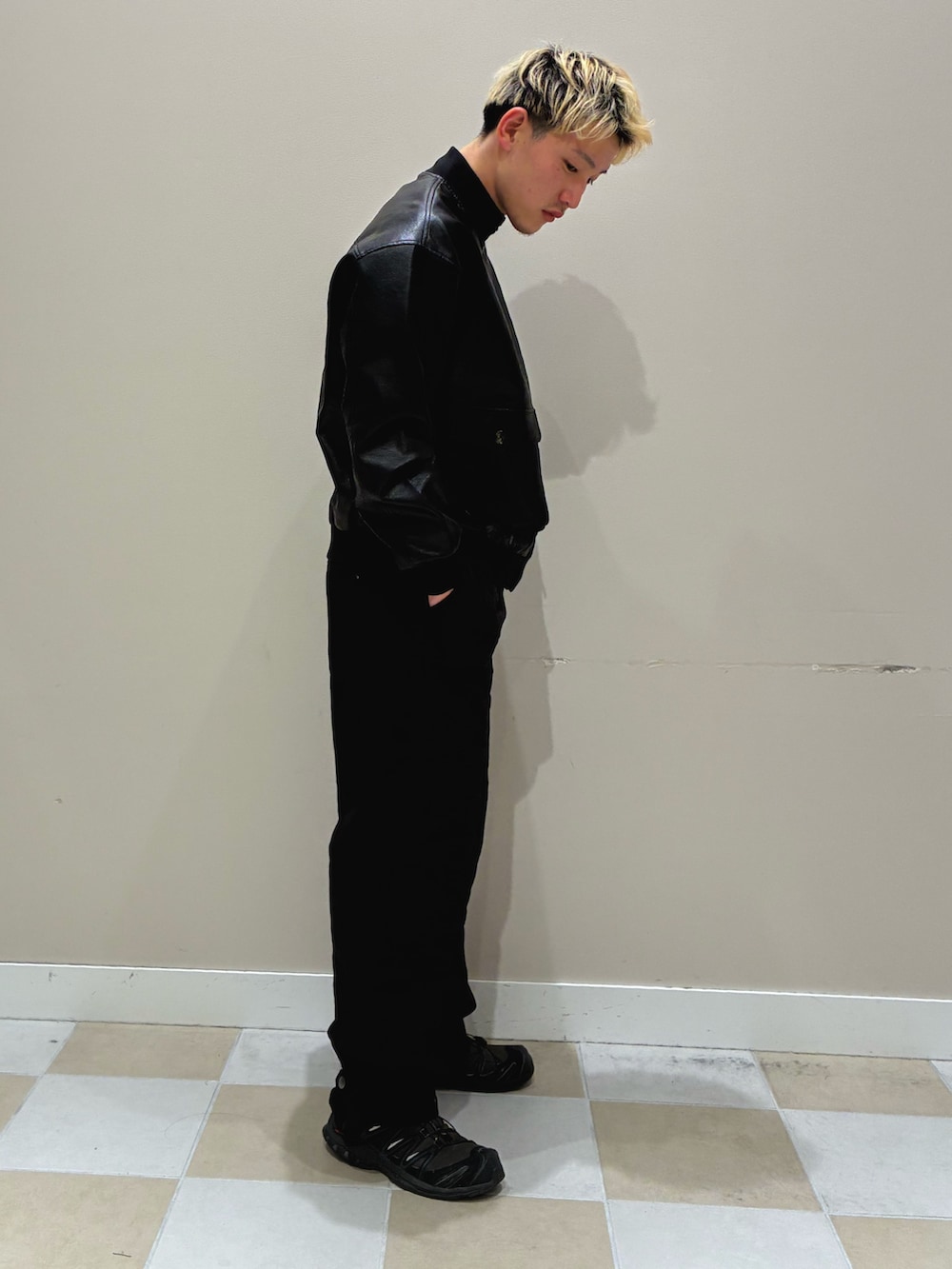 レザーの光沢、ニットの柔らかさ、パンツのマットな質感という「異なる黒」を重ねることで、ワントーンでも奥行きのある洗練されたストリートスタイルに仕上げました。
