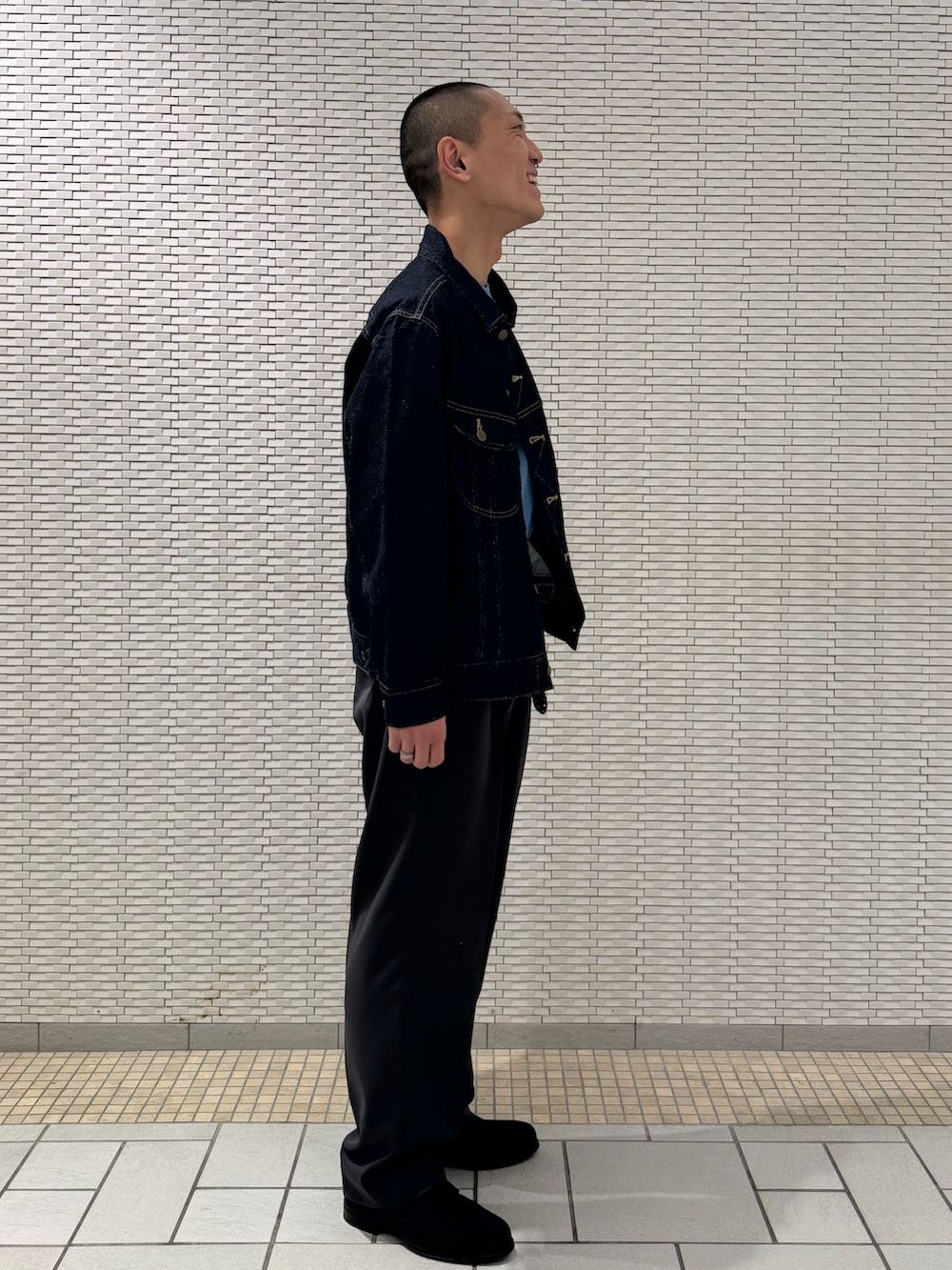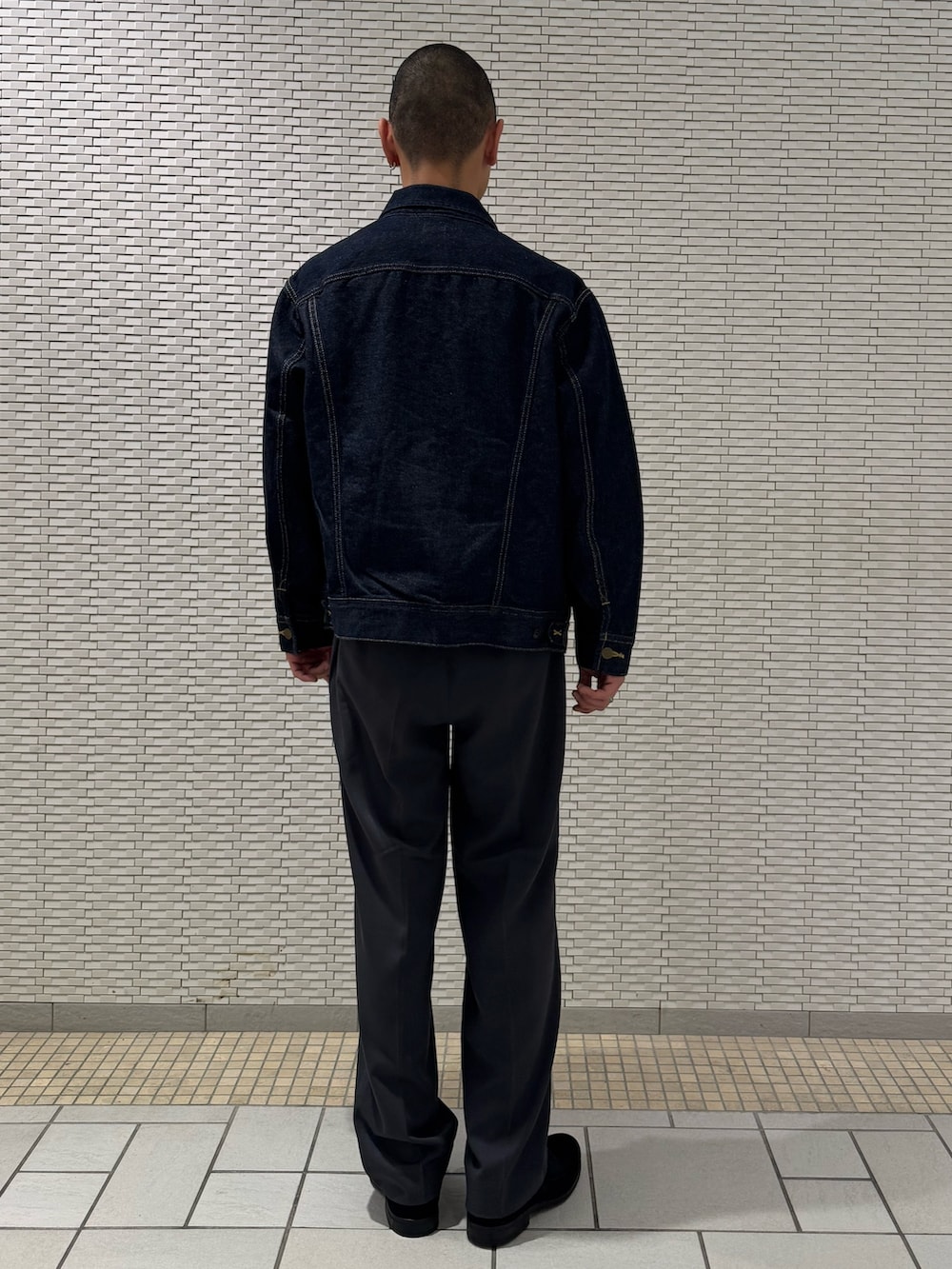 別注Leeのデニムジャケット!アームホールや身幅はゆったりとしてるため重ね着もしやすいのが嬉しいポイント!丈感はスッキリめなクラシカルな要素もあり良いとこ取りのジャケットです!