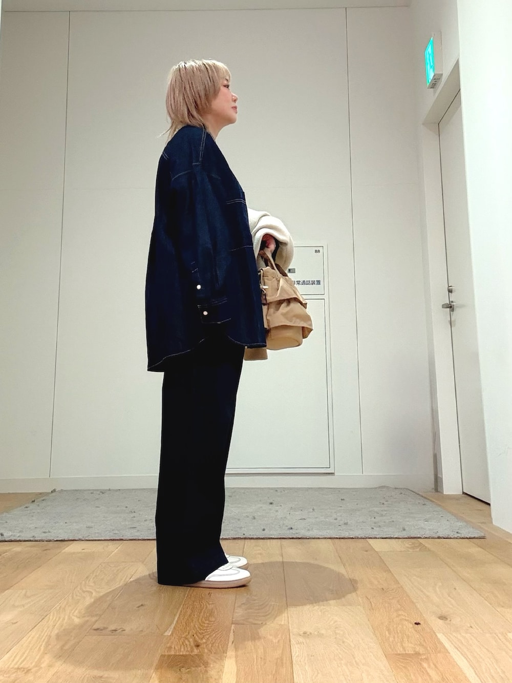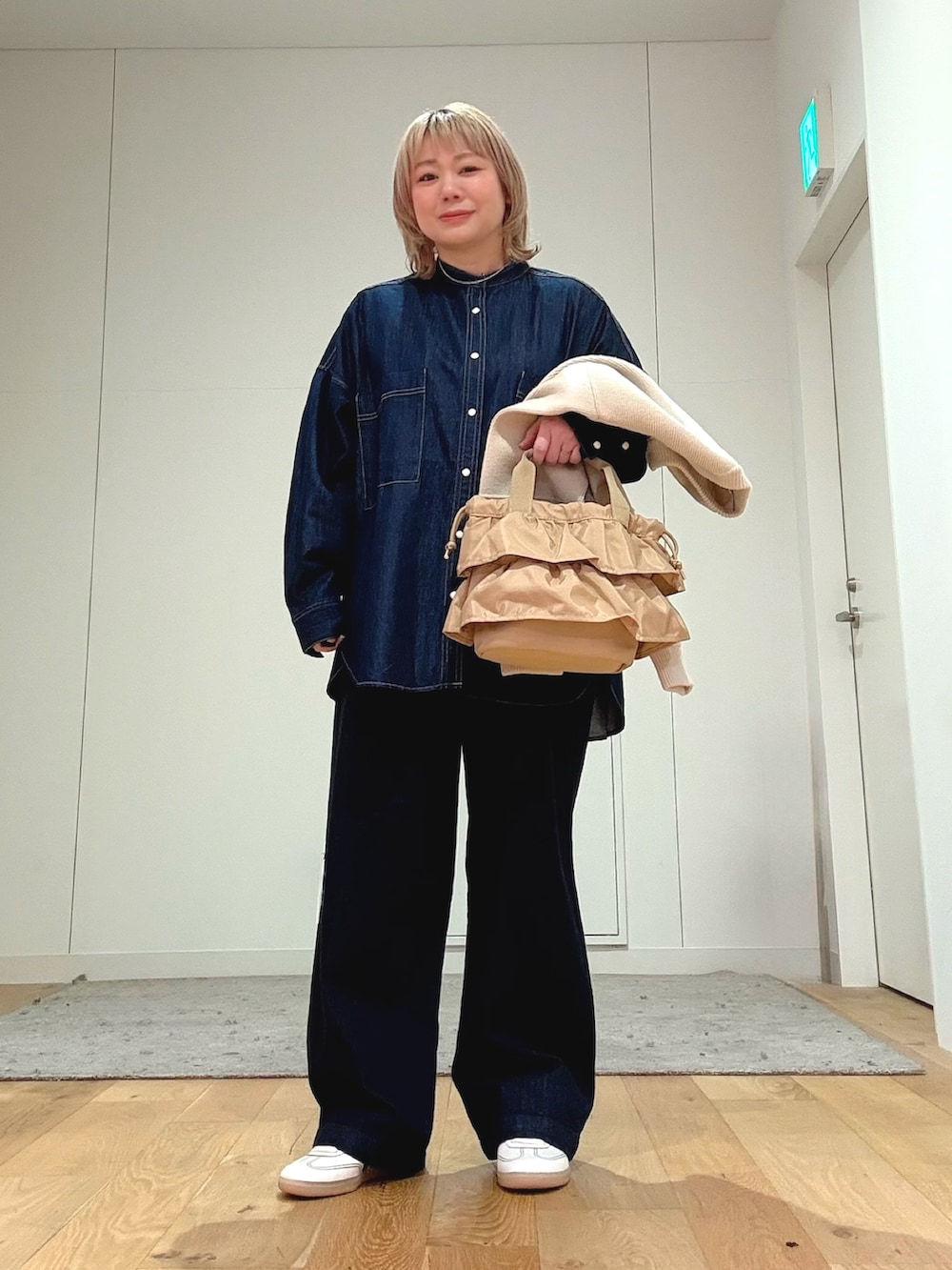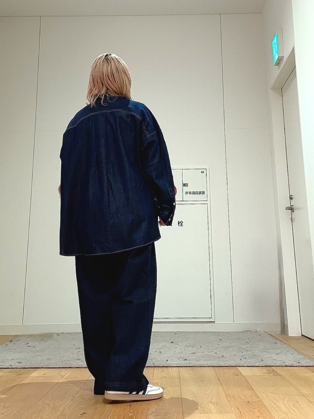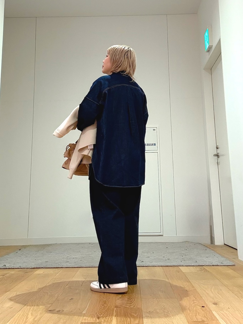 デニムシャツ×ワイドデニムのセットアップ風コーデ。
