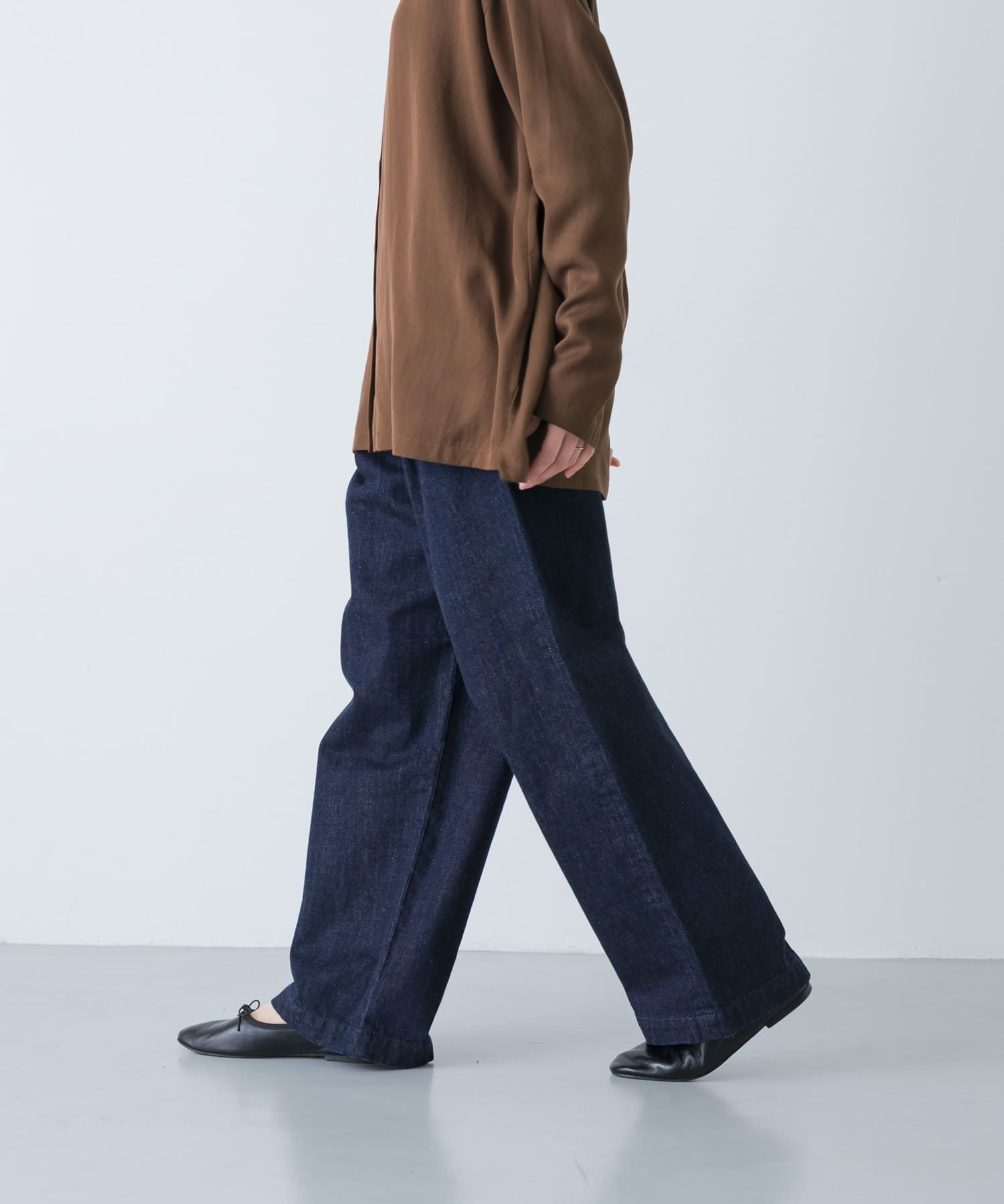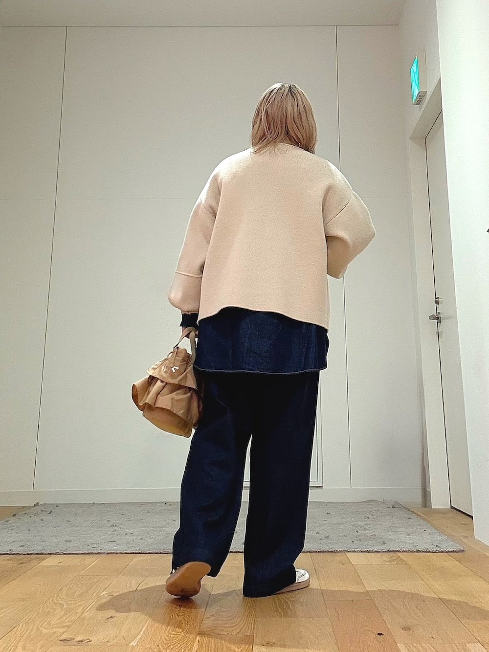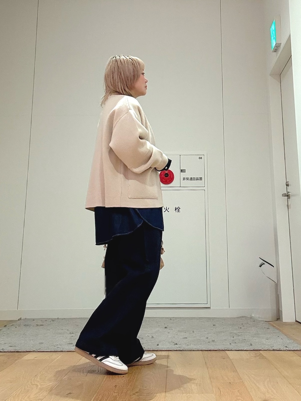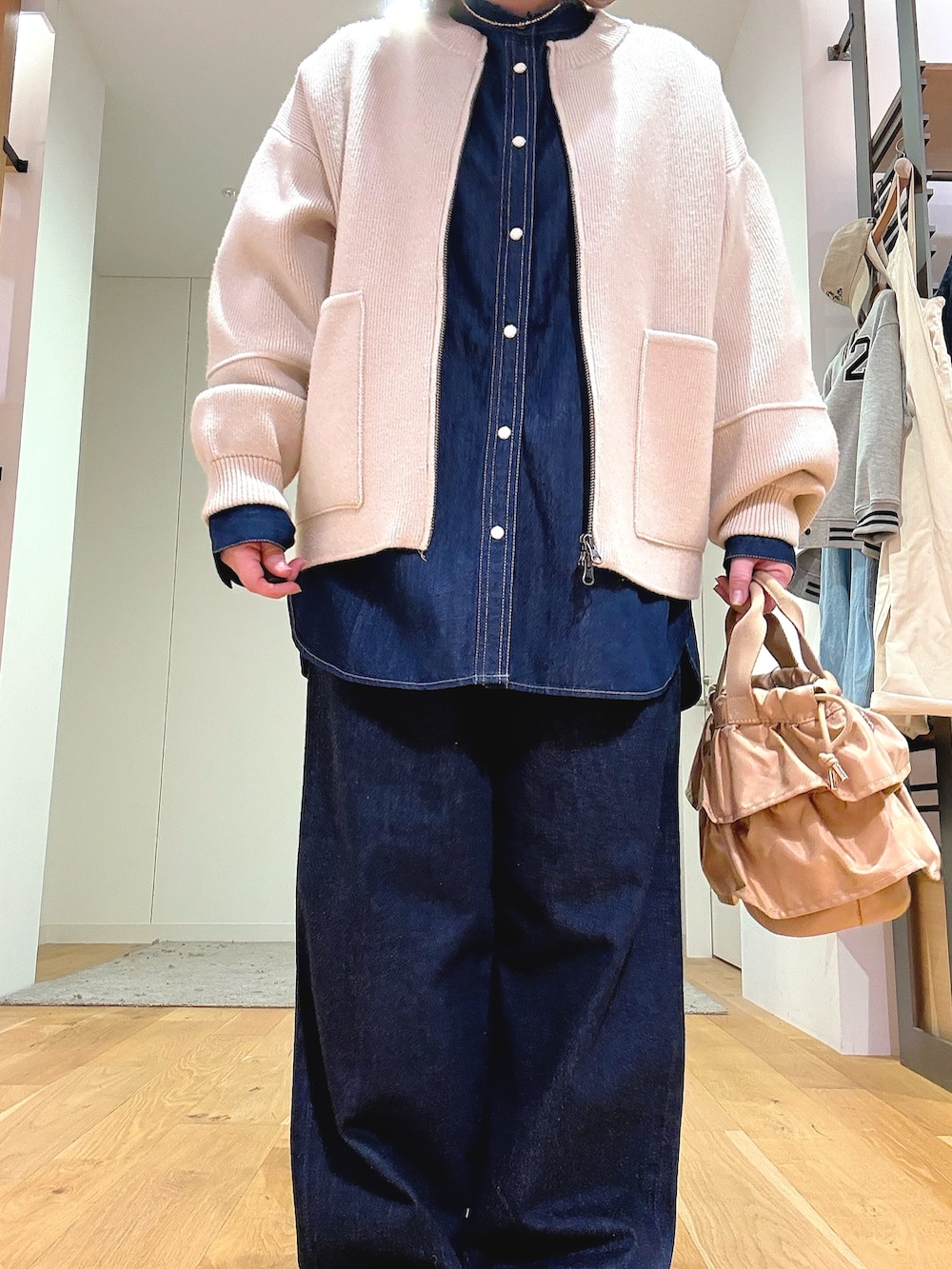 デニムシャツ×ワイドデニムのセットアップ風コーデ。