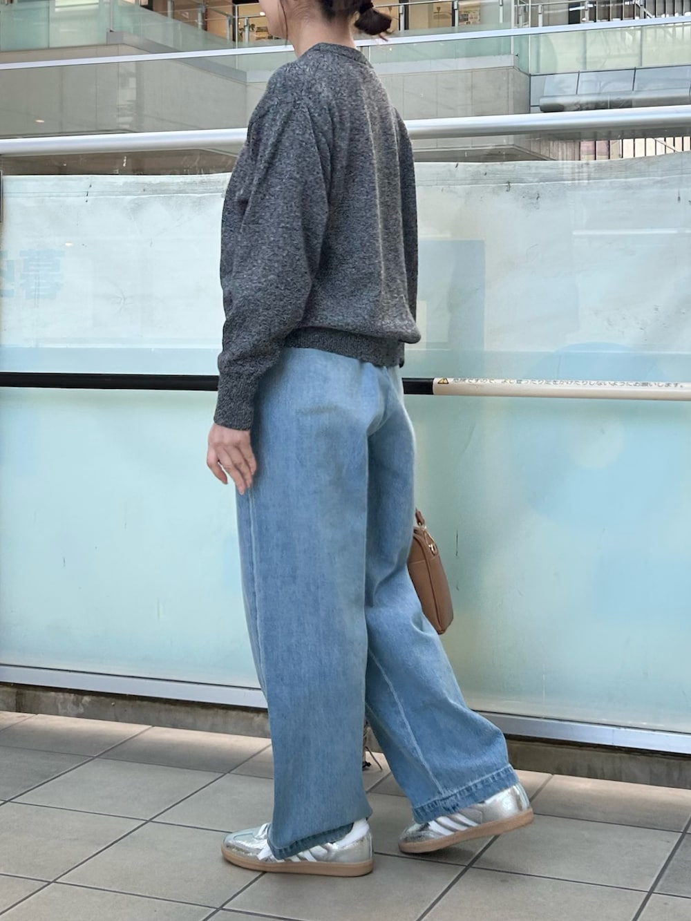 シンプルなコーディネートなので足元はシルバーのスニーカーを合わせました。