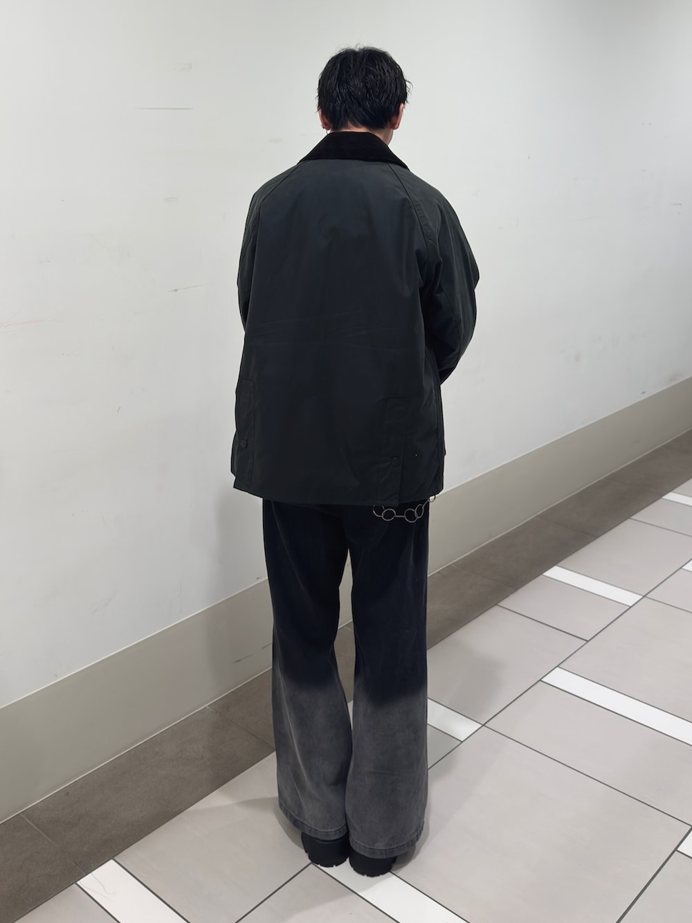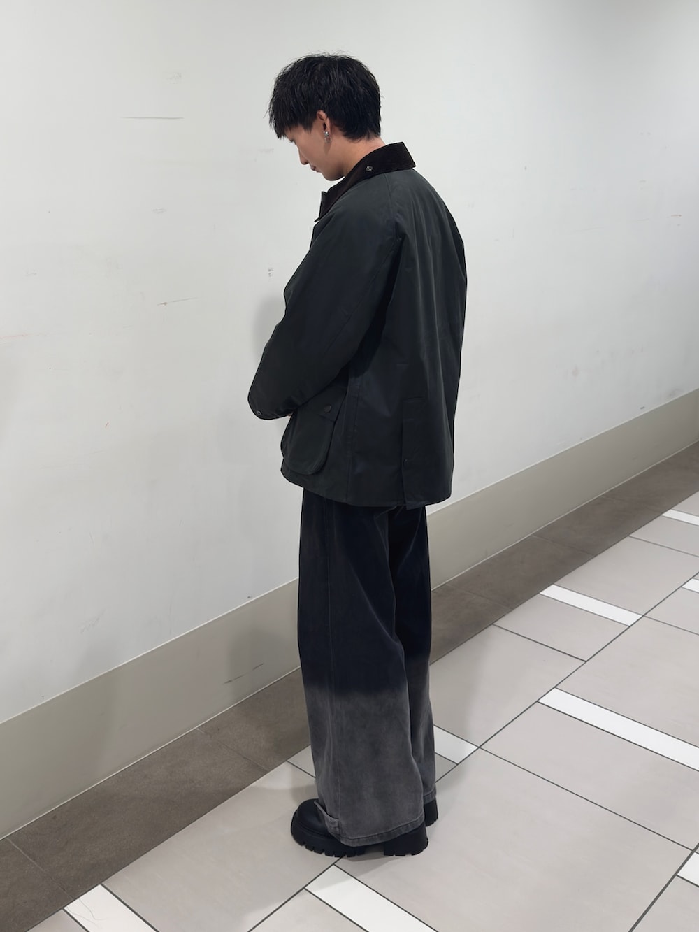 Barbour のOS BEDALE MAX JACKETをアウターに、求心柄モックネックニットを合わせたコーディネートです。