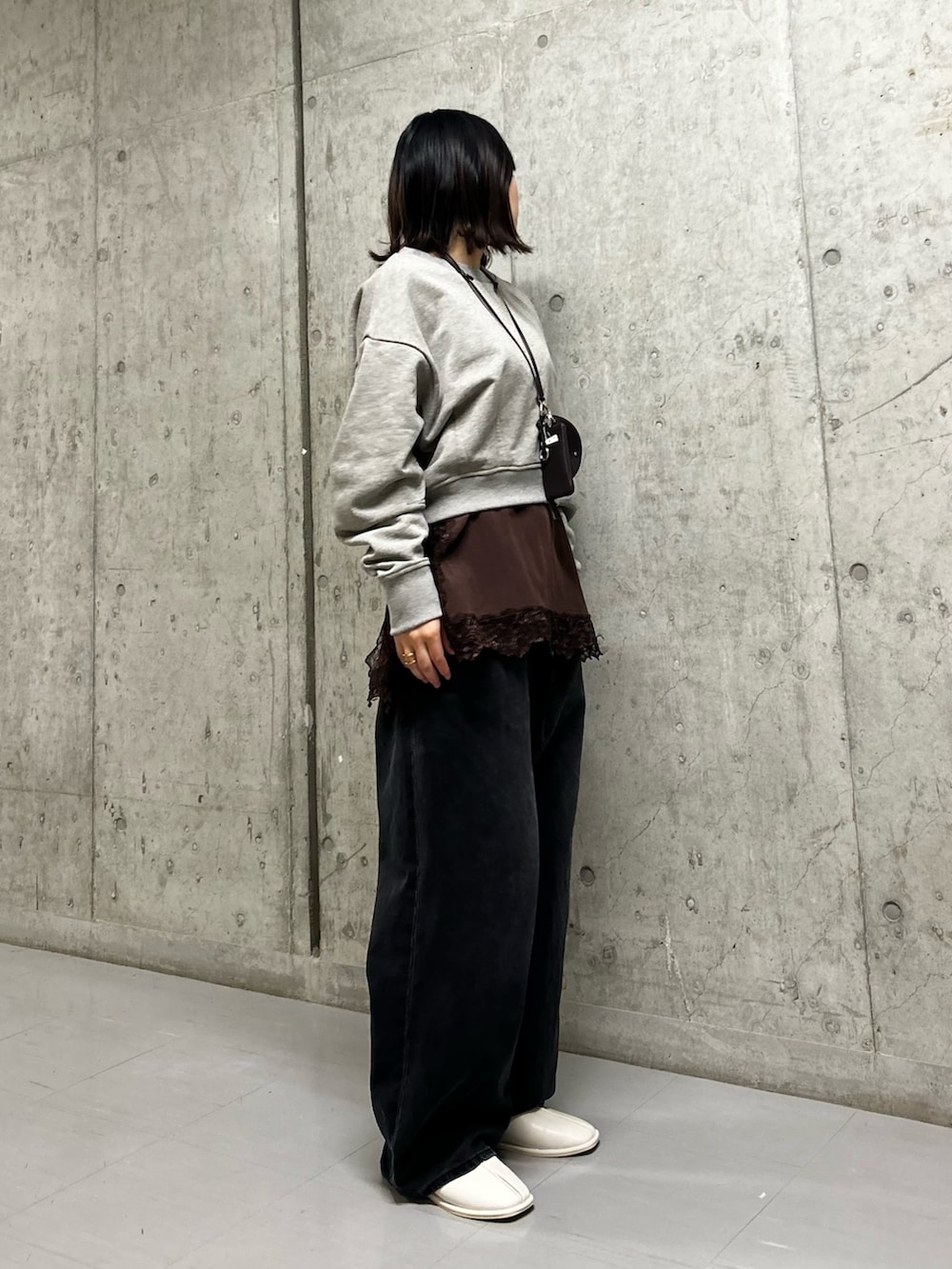 首にはポーチのストラップをかけてみました!シンプルなカラーのトップスにアクセントとして持つのが🙆♀️
