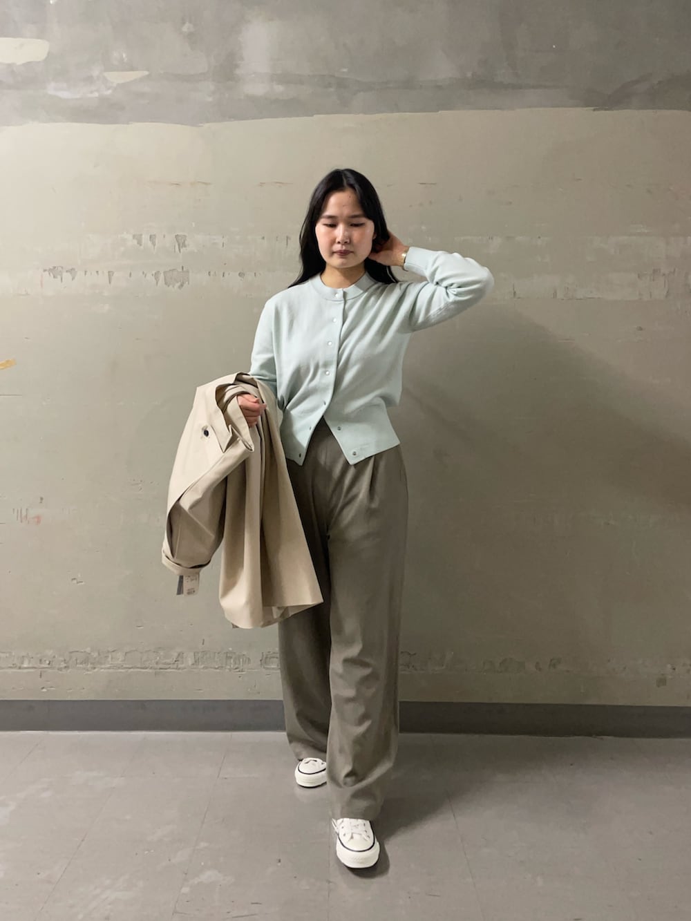 オフィスにもお休みの日にも取り入れやすい、着回し力の高いスタイリングです。