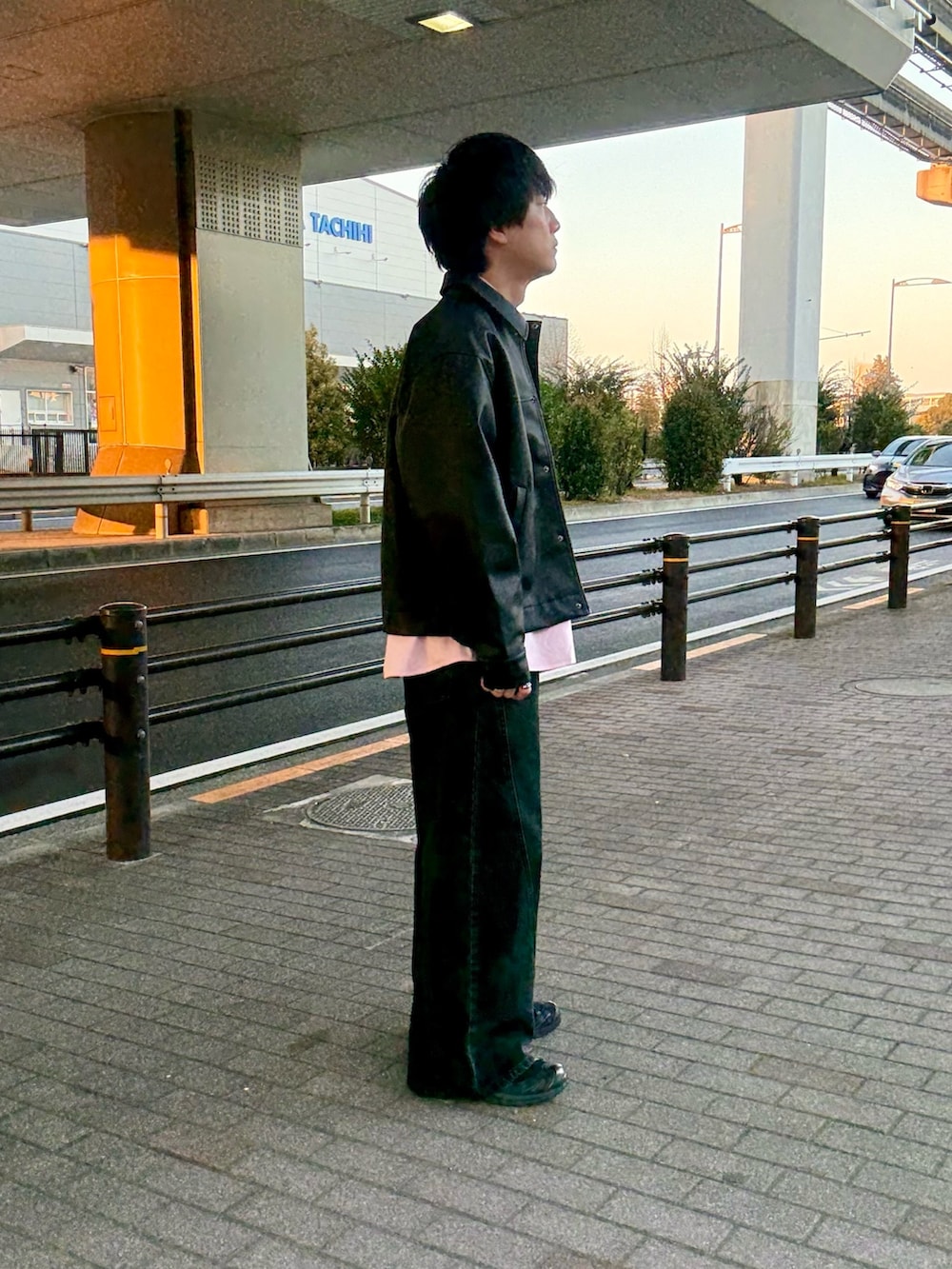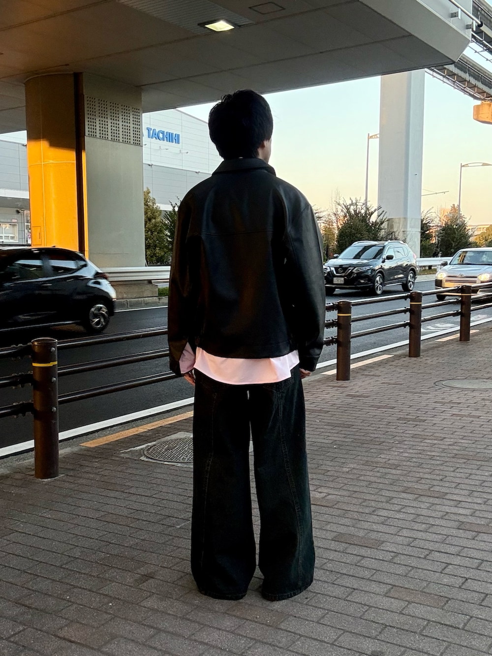 レザージャケットにデニムパンツ合わせで、差し色にピンクのシャツを使って春らしいスタイリングにまとめてます( ・ᴗ・ )