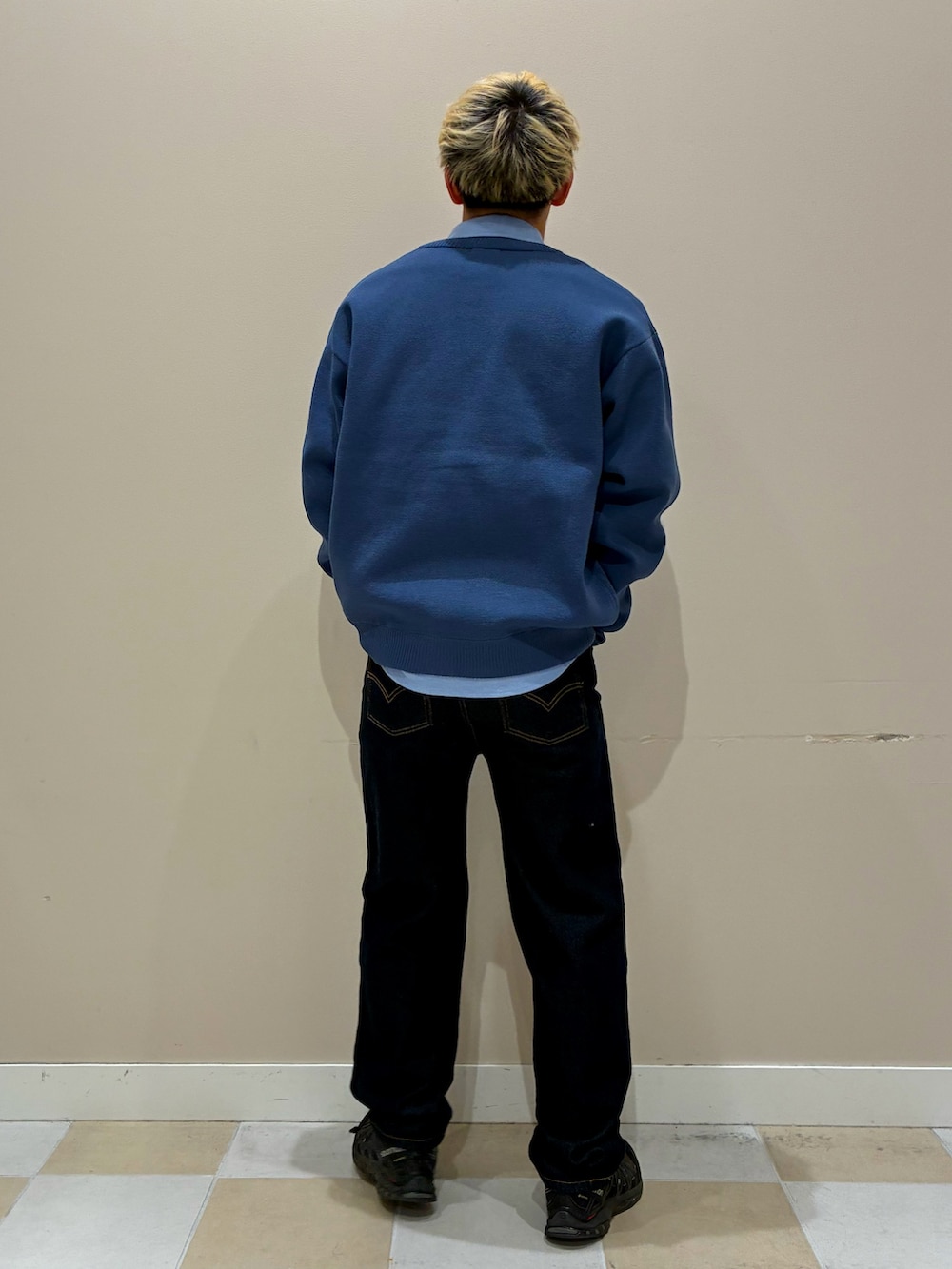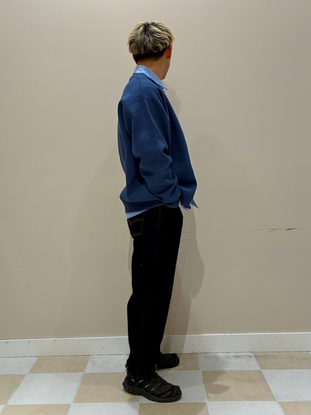 明るめのブルーが季節感を演出し、重たくなりがちなインディゴパンツも春仕様の軽やかな印象に仕上げています。