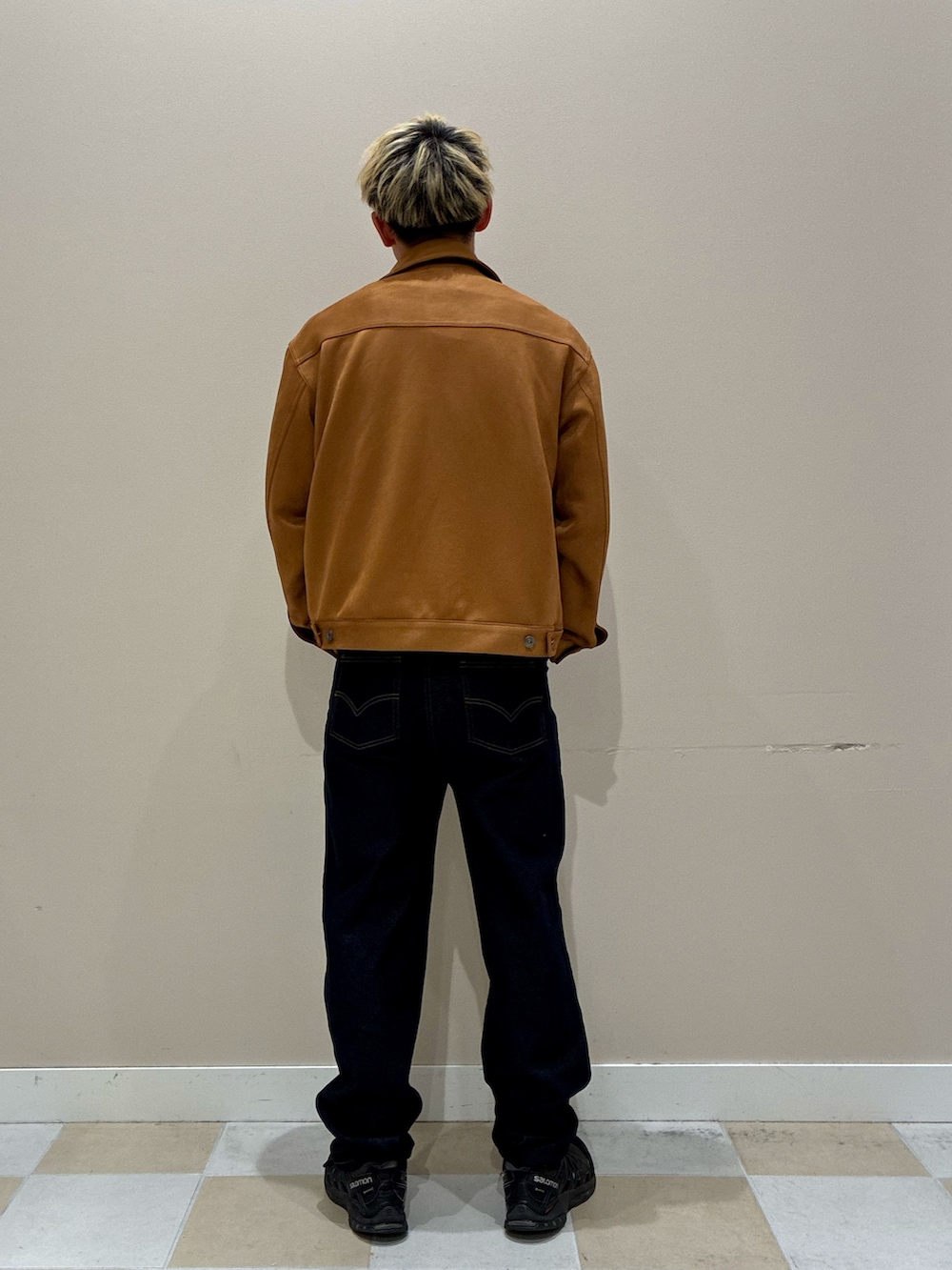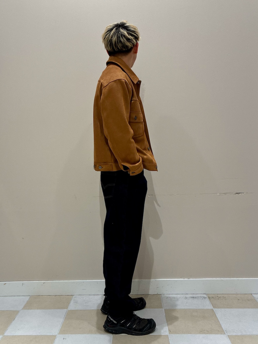 春に映えるライトブラウンのジャケットを主役にした、季節感たっぷりのカジュアルコーデ。