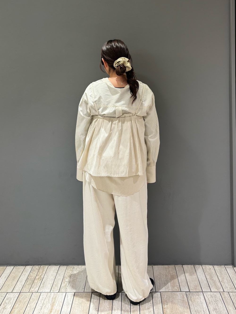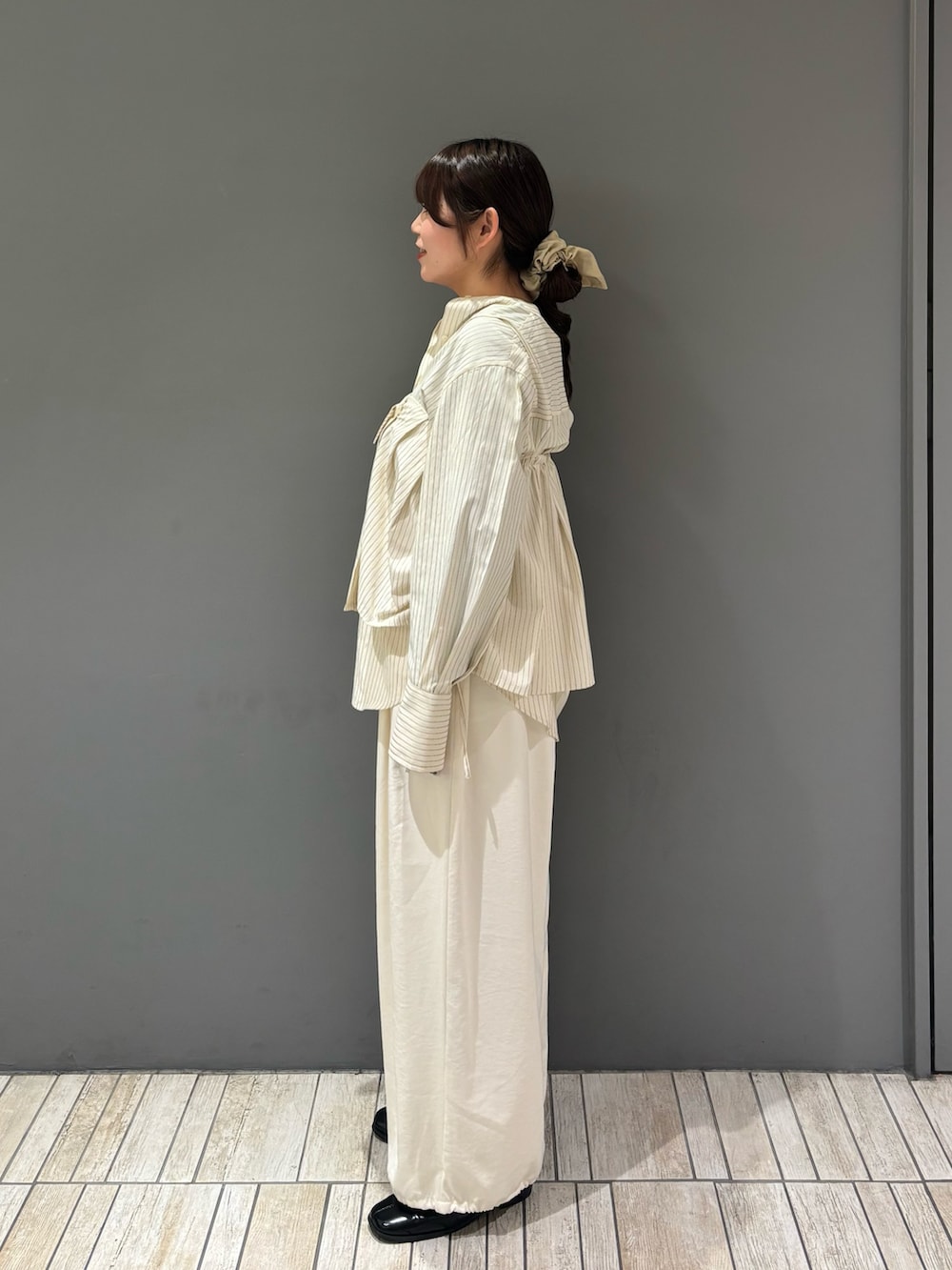 着てみた感じ、シャツはジャストサイズより少し大きめのサイズ感でした!バンドカラーなのでボタンを一番上まで閉めると首が詰まって見えるので、骨格ストレートさんはボタンを開けるとスッキリして見えますദ്ദി ῀ᢦ῀ )