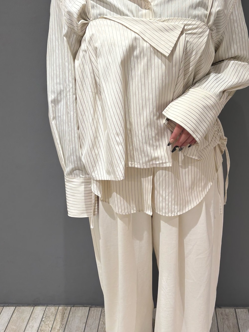 ストライプ柄のバンドカラーのシャツは使いやすいカラーとシンプルなデザインなので、パンツやスカート問わず使っていただけます!