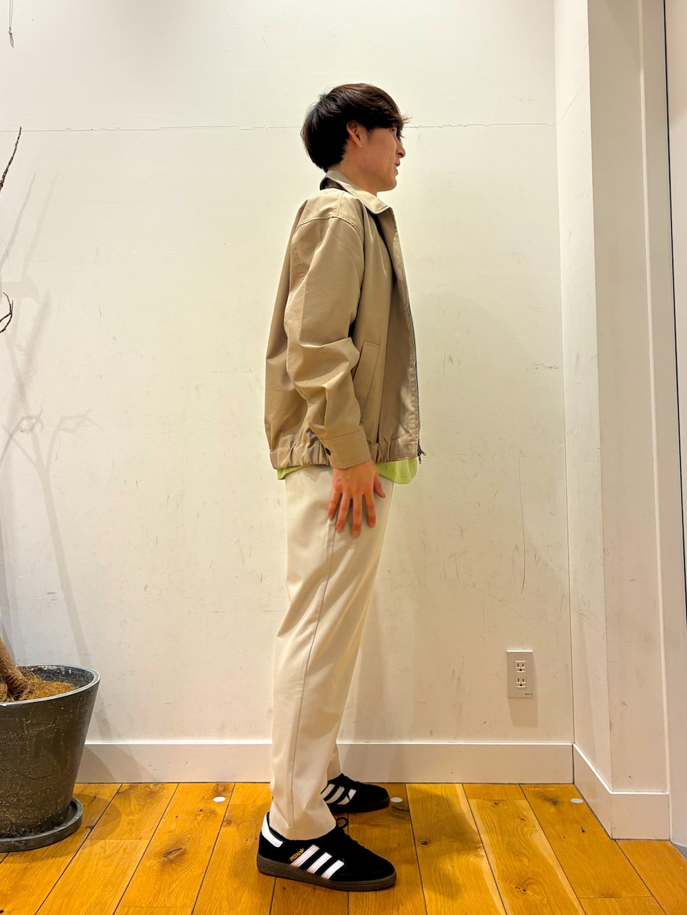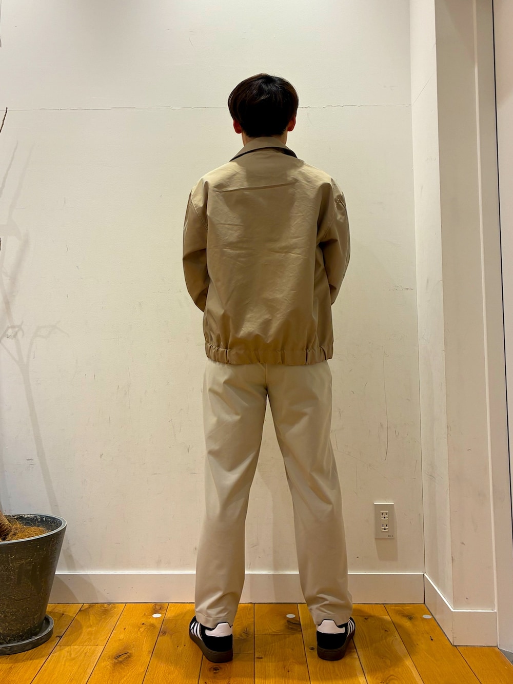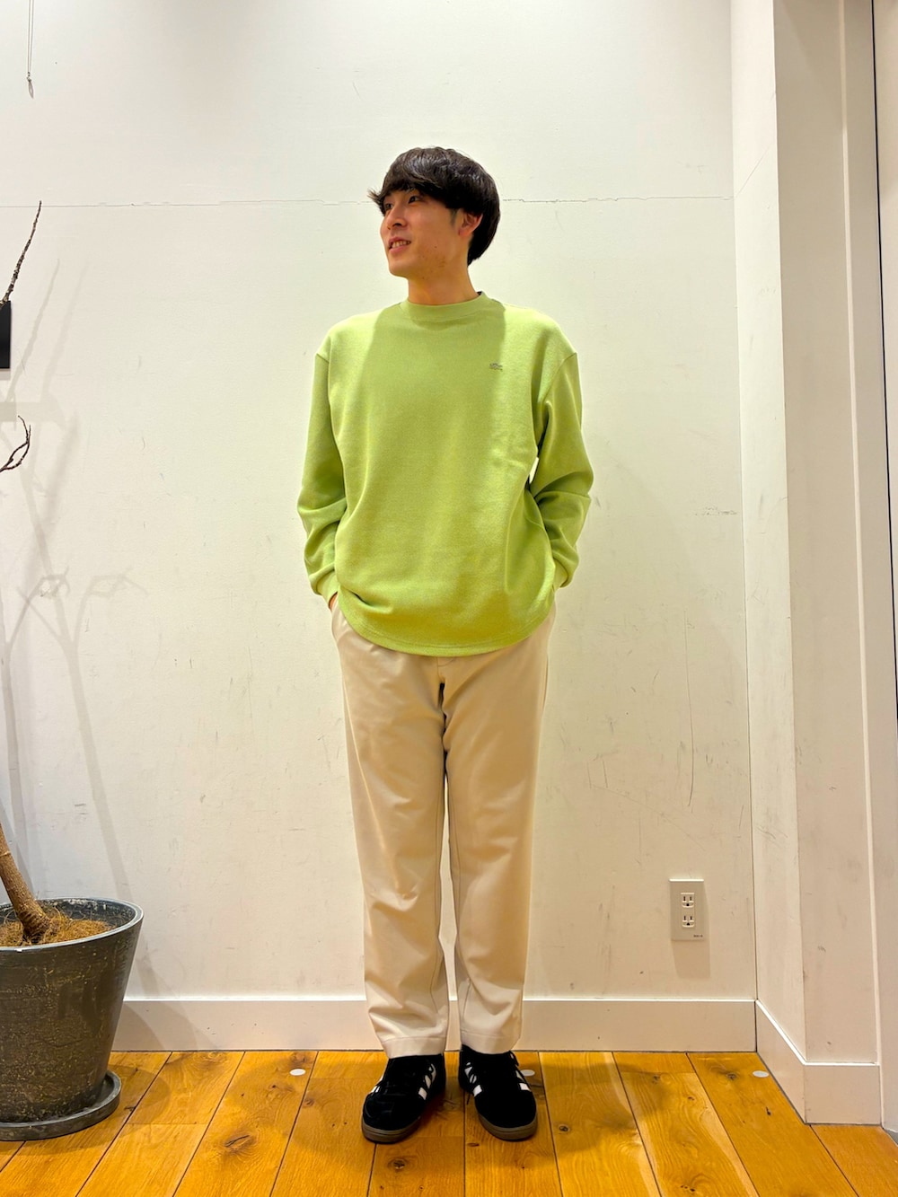 ワッフル生地になっており滑らかな肌触りがするラコステとの別注ロンTの上に薄手で柔らかい生地になっているジャケットを着ています!!パンツは上に合わせてゆったりとして柔らかい生地を使っているものにしています!