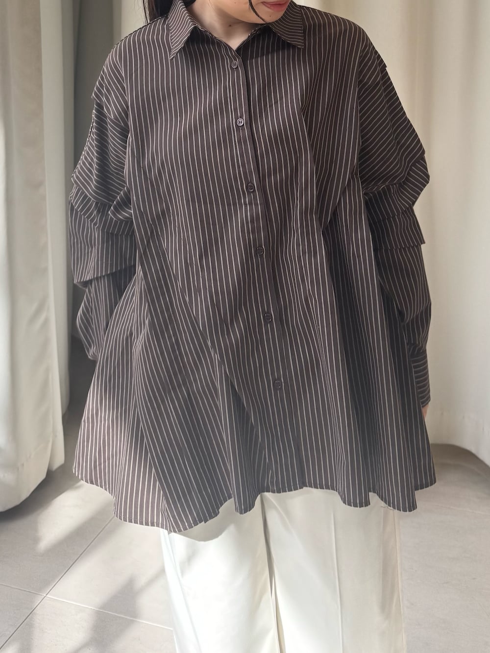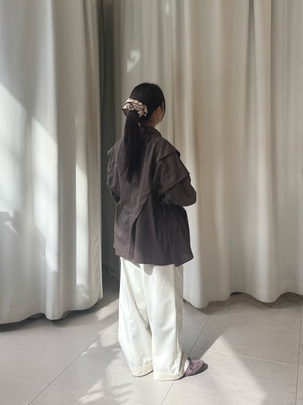シャツと合わせてブラウンのスニーカーにし、トップスのストライプが白なのでパンツ、シュシュを白で合わせて全体の統一感をだしました。