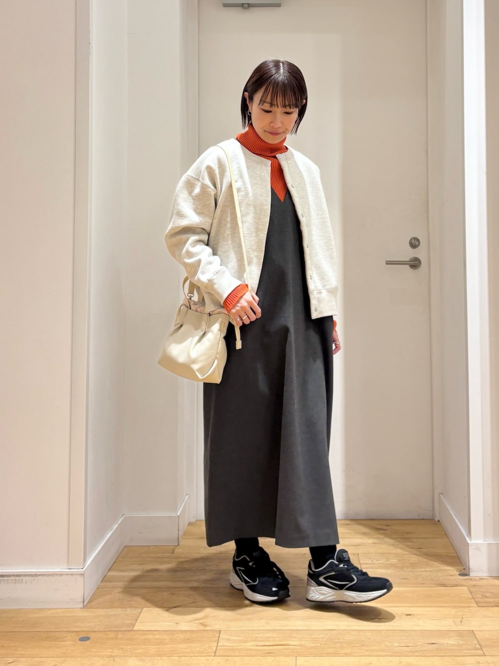 カーディガンは、カジュアルな印象になりがちなスウェット素材ですが、シンプルなデザインなので合わせるインナー次第でキレイめにも合わせやすいですよ◎
