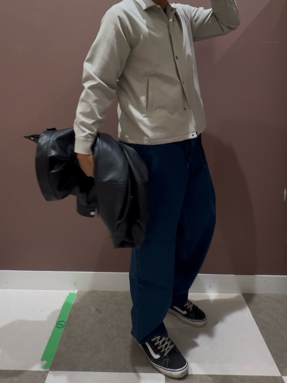 コーチジャケットの軽さと柔らかさが、レザーの重厚感をほどよく中和し、ラフだけどこなれたバランスに仕上げています。