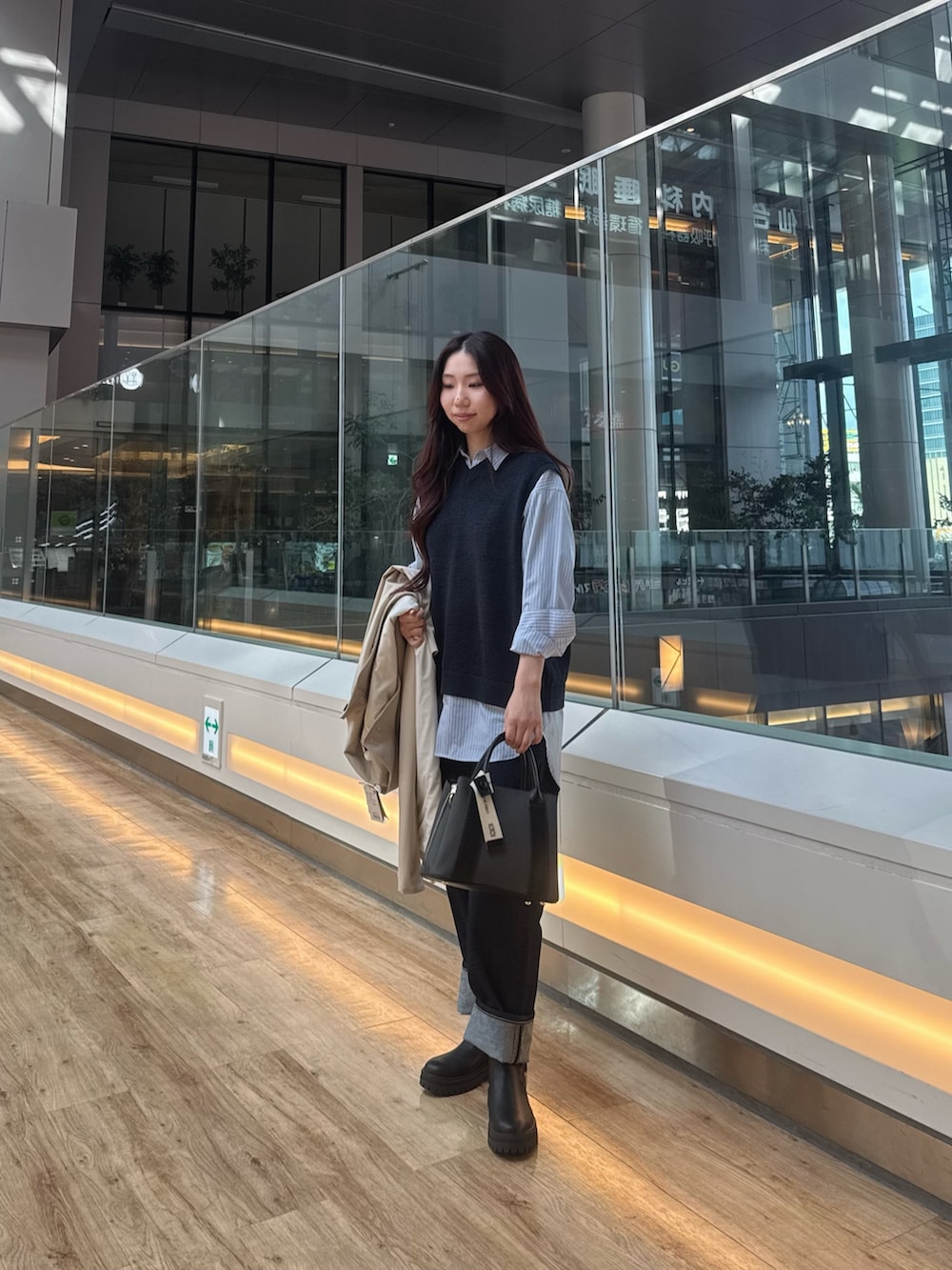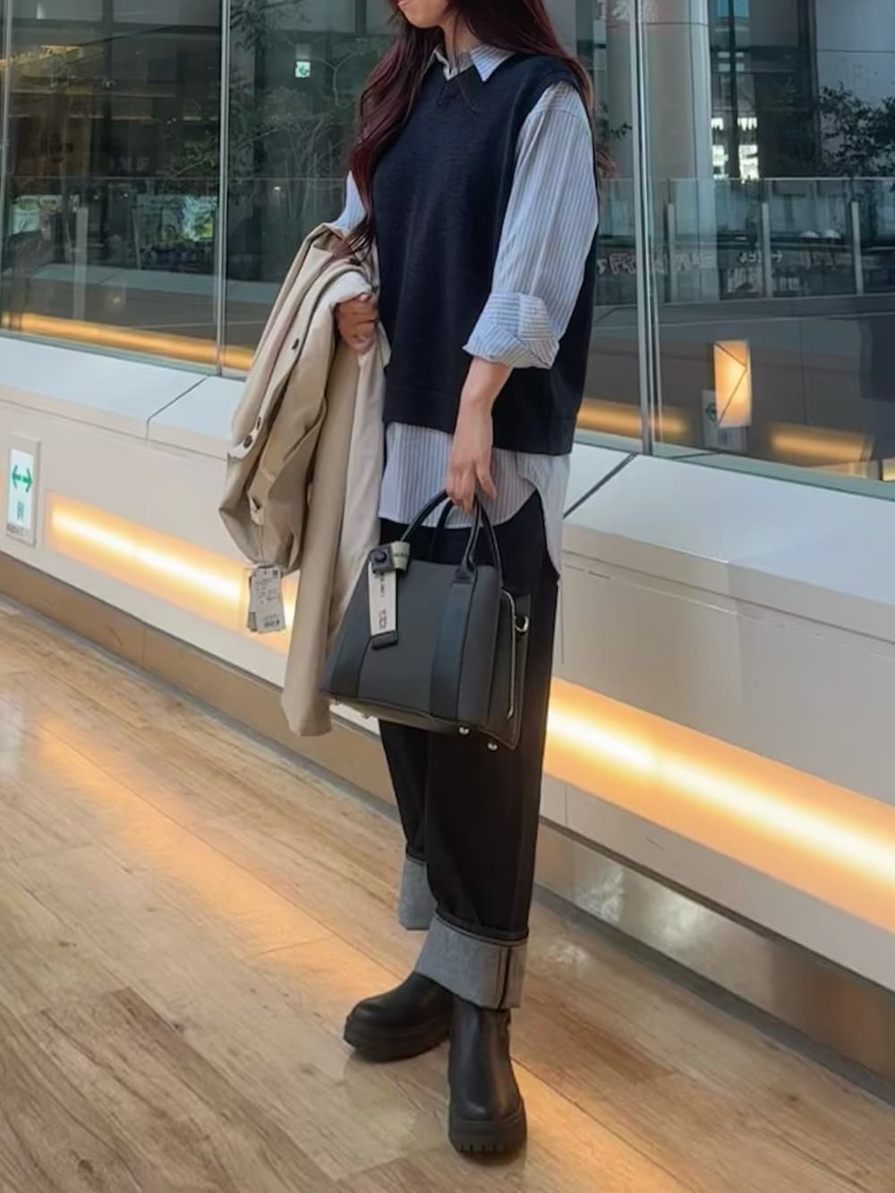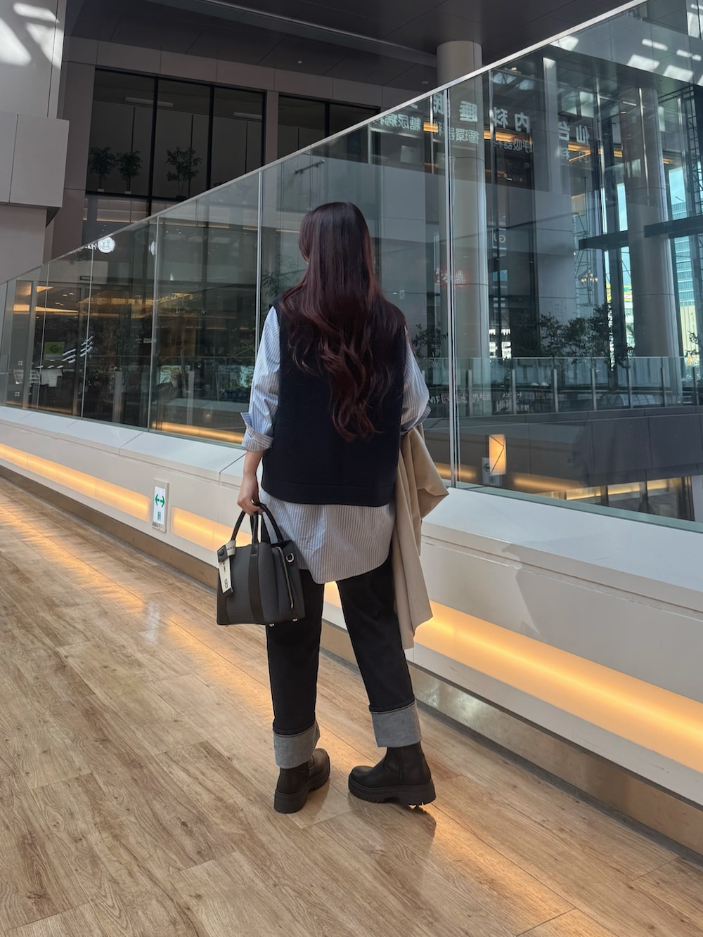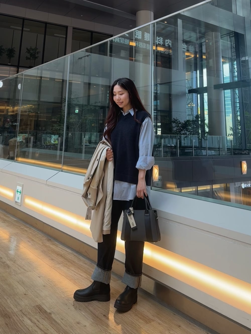 Vネックニットベストの中にはEKALのシャツをレイヤード!このシャツはオーバーサイズめなのが可愛くて、ニットベストやスウェット、ニットの中に着用するのにぴったりなアイテムです🍀 もう少し暖かくなったら、羽織ものとして着るのも🙆🏻‍♀️ 着回しがたくさんできるシャツです!!