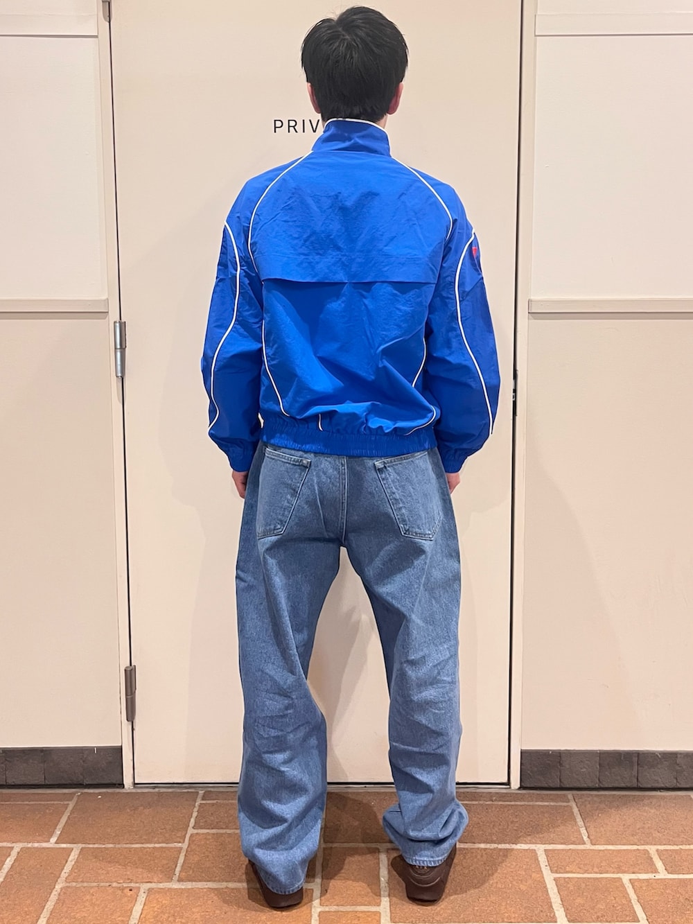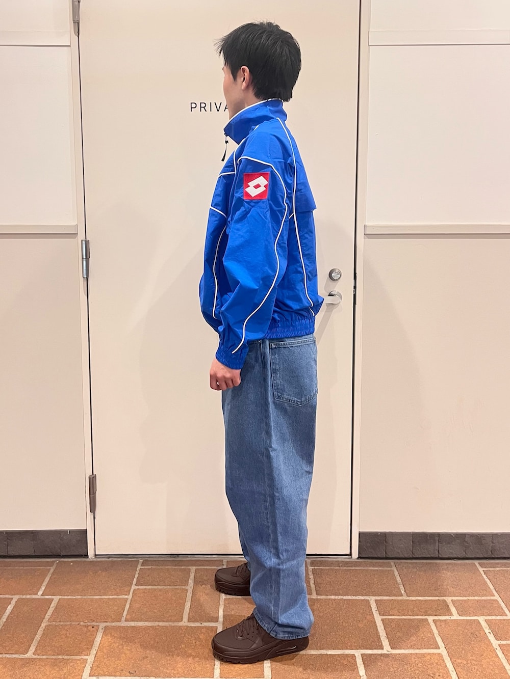 デニムパンツはストリートらしいシルエット、ウェスト大きめですが暇で調節可です