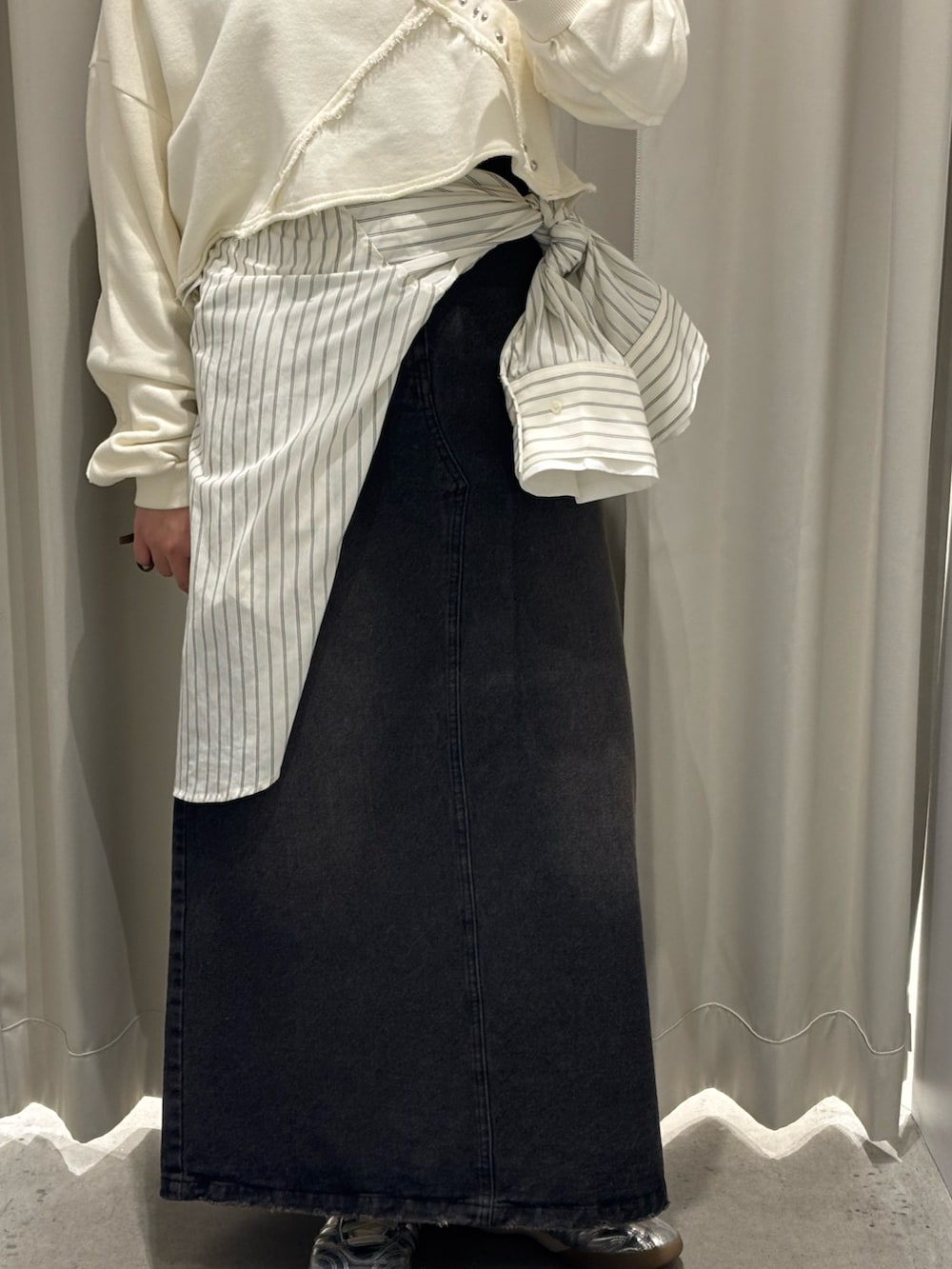 短丈のトップスと合わせて、腰周りのシャツでアクセントにしました✨️