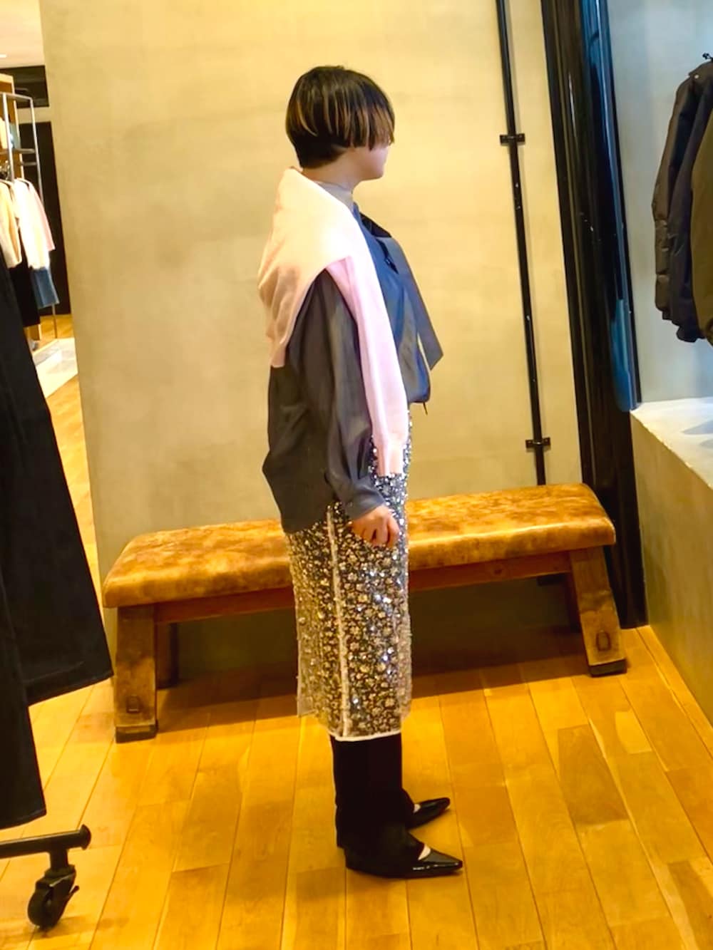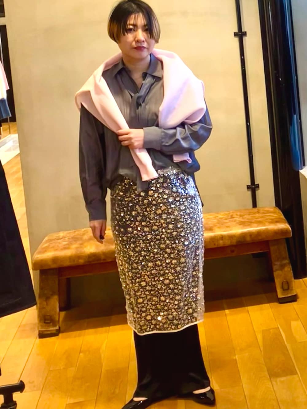 トレンドのスパンコールのスカートはデニム、スラックスに合わせていつもと一味違うコーデのプラス1アイテムとして。