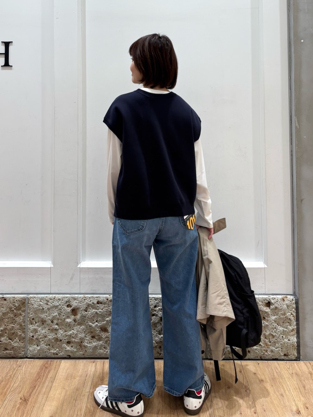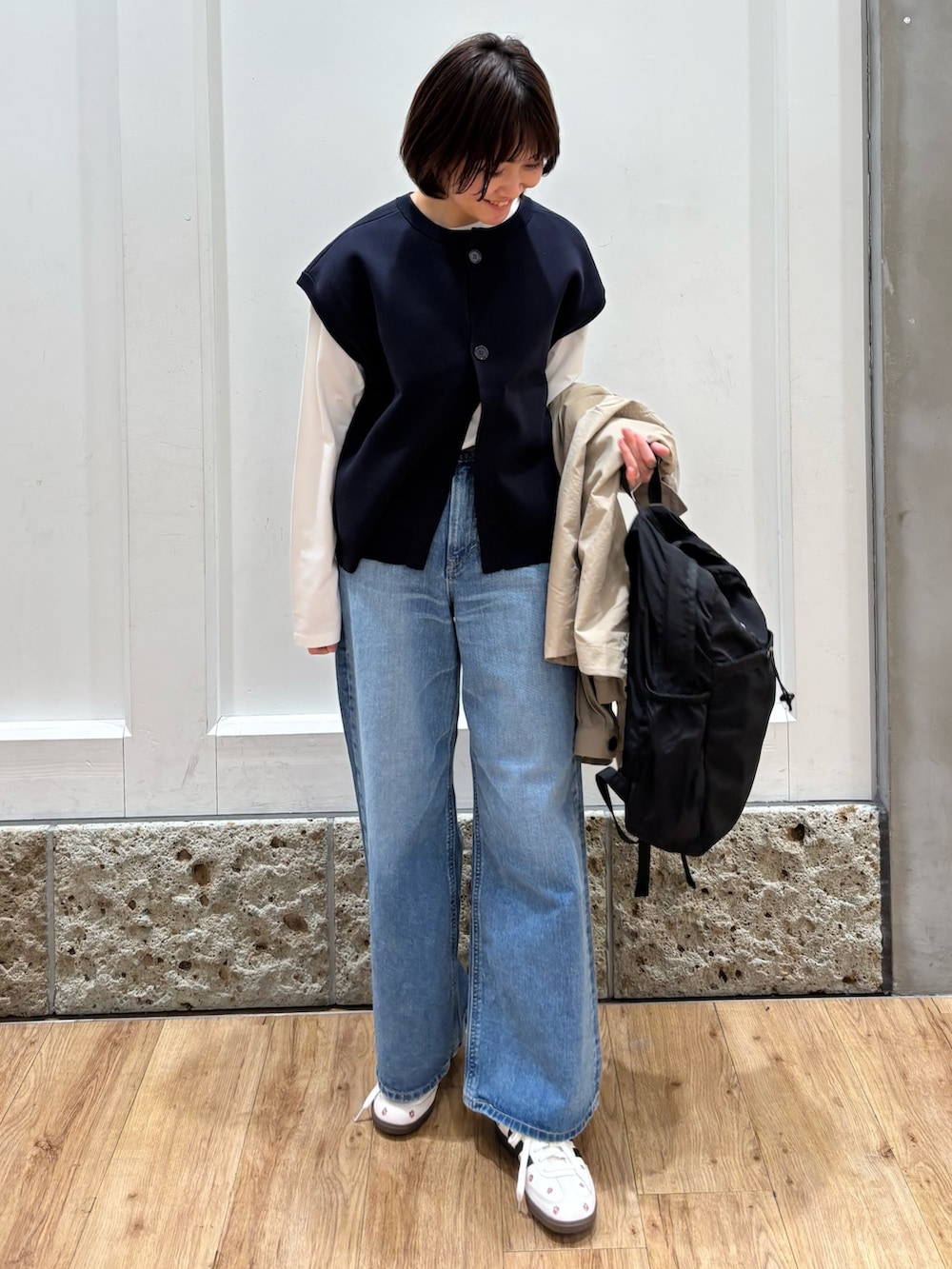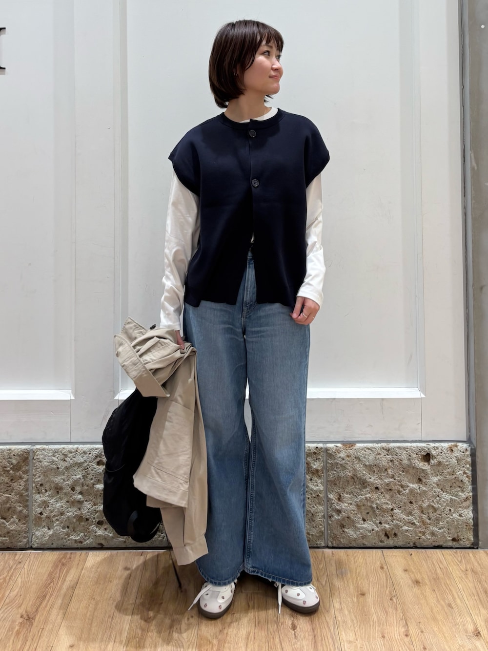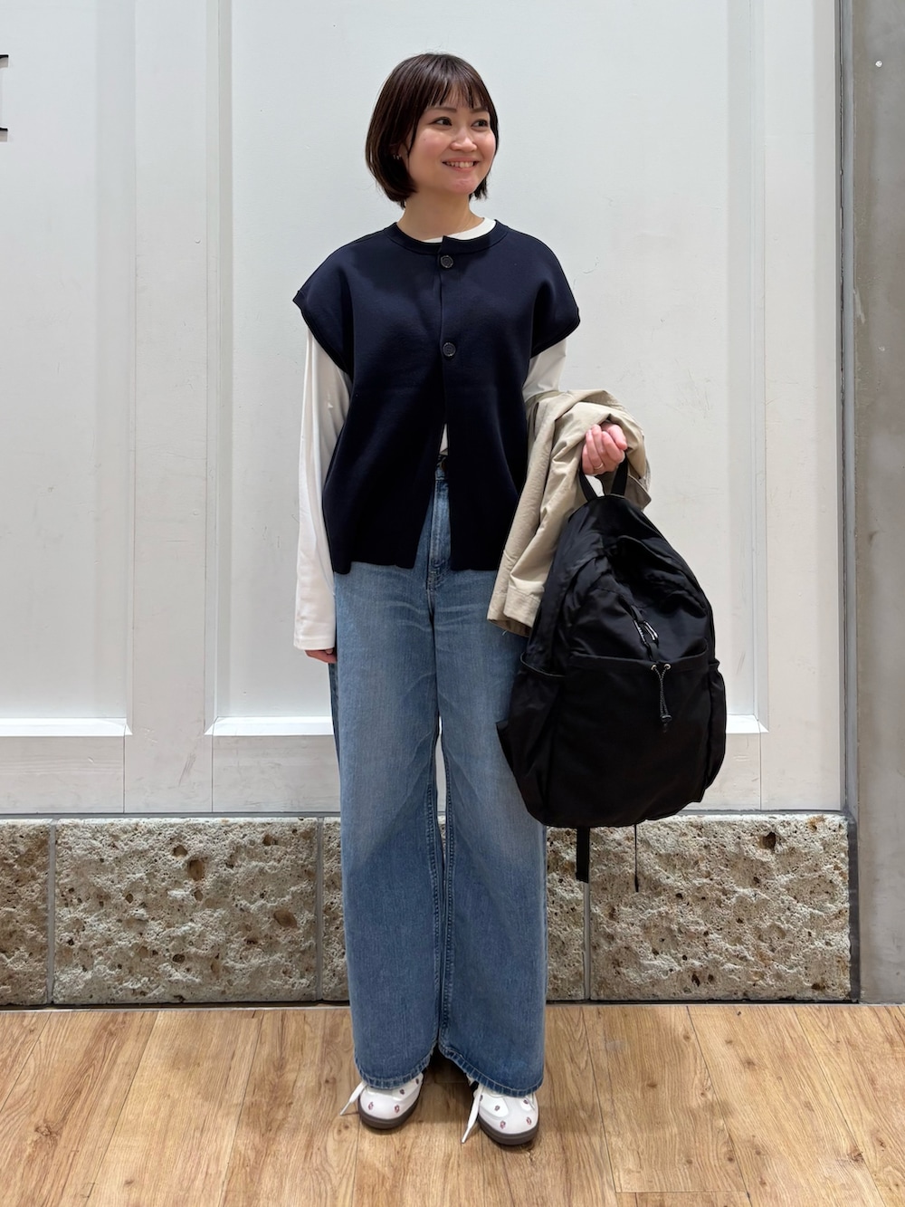 ベスト生地が柔らかく毛玉やシワになりにくい素材ですよ!二の腕がカバーできるのもいいですね◎シャツやタートルネック合わせも可愛いと思います!