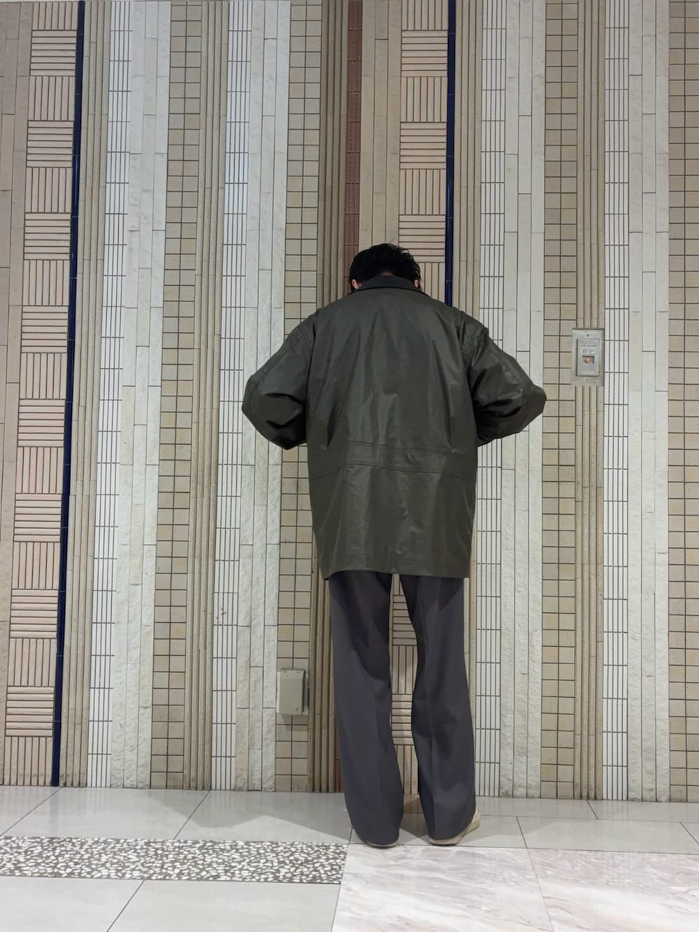 さて、寒々しい格好になっております。ポリ、ナイロンの薄い生地です。三寒四温の来月辺りから出番が増えることでしょう。先物買いの感覚になります。今のタイミングだと中物としての使い方がリアルなのかもしれません。襟が革のシャツという見立てもできるモノです。