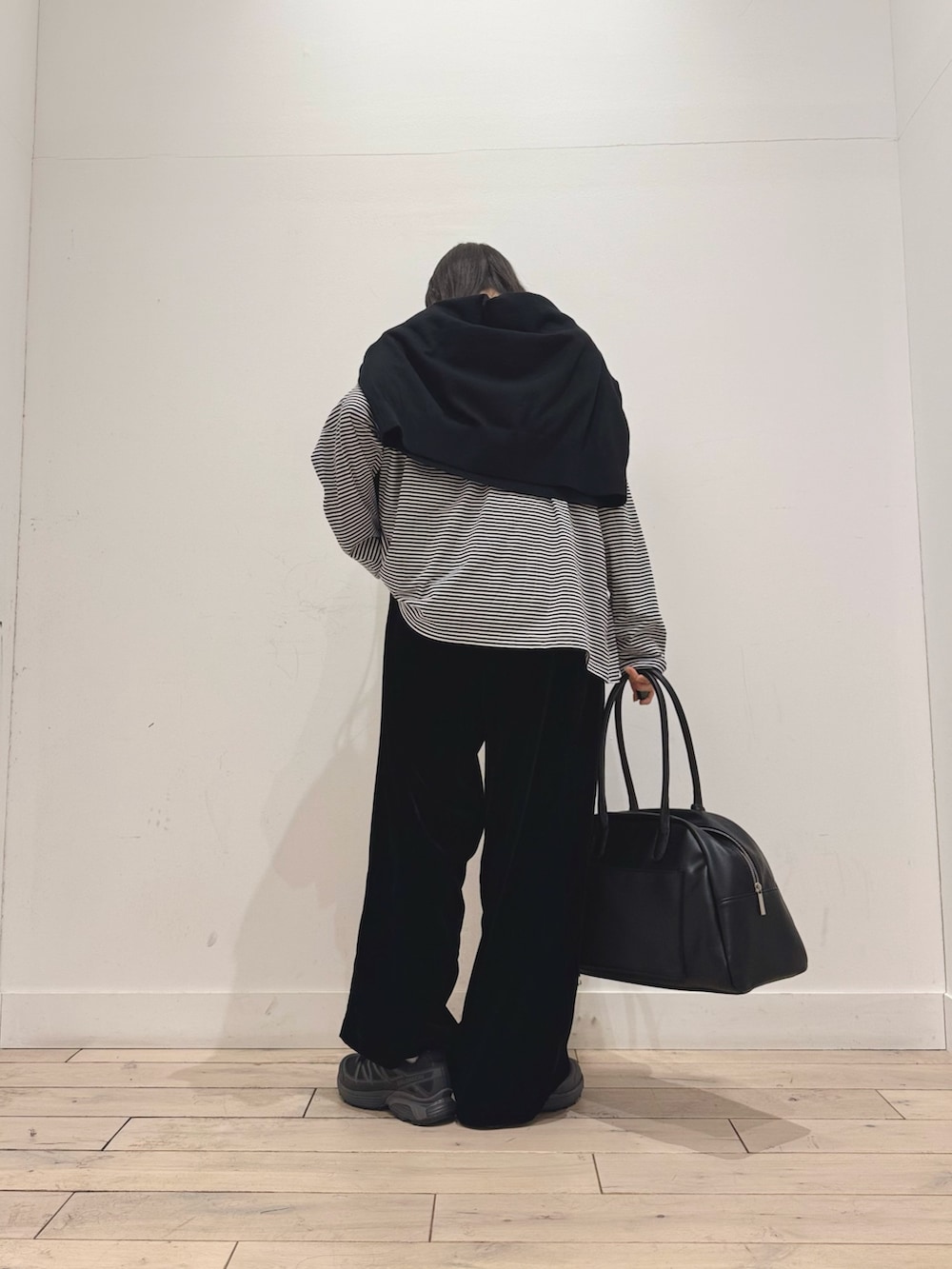 きれいめなベロアパンツをカジュアルにしたかったので、ボーダーカットソーとスニーカーを合わせました‼︎
