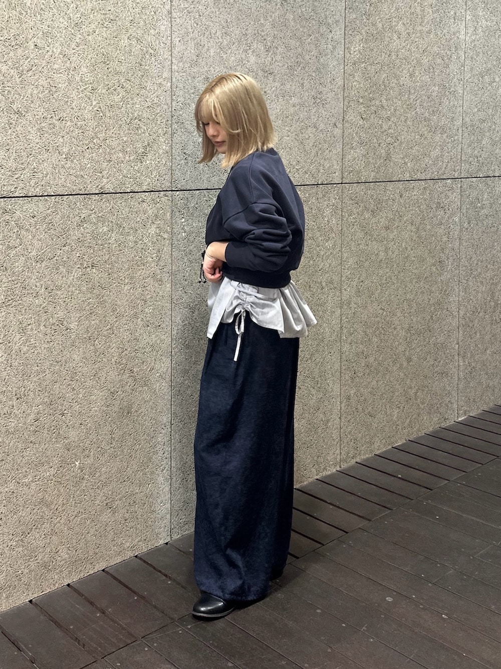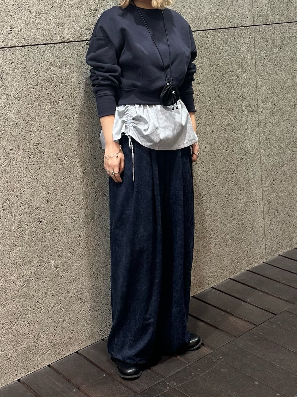 シンプルにスウェット+ワイドパンツの組み合わせ!ただ、シンプルすぎないようビスチェにもなるブラウスをスカート風に✨