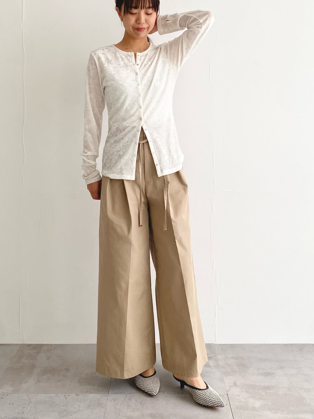 ボタンは下から4つくらいまで開けて着るのがおすすめです!