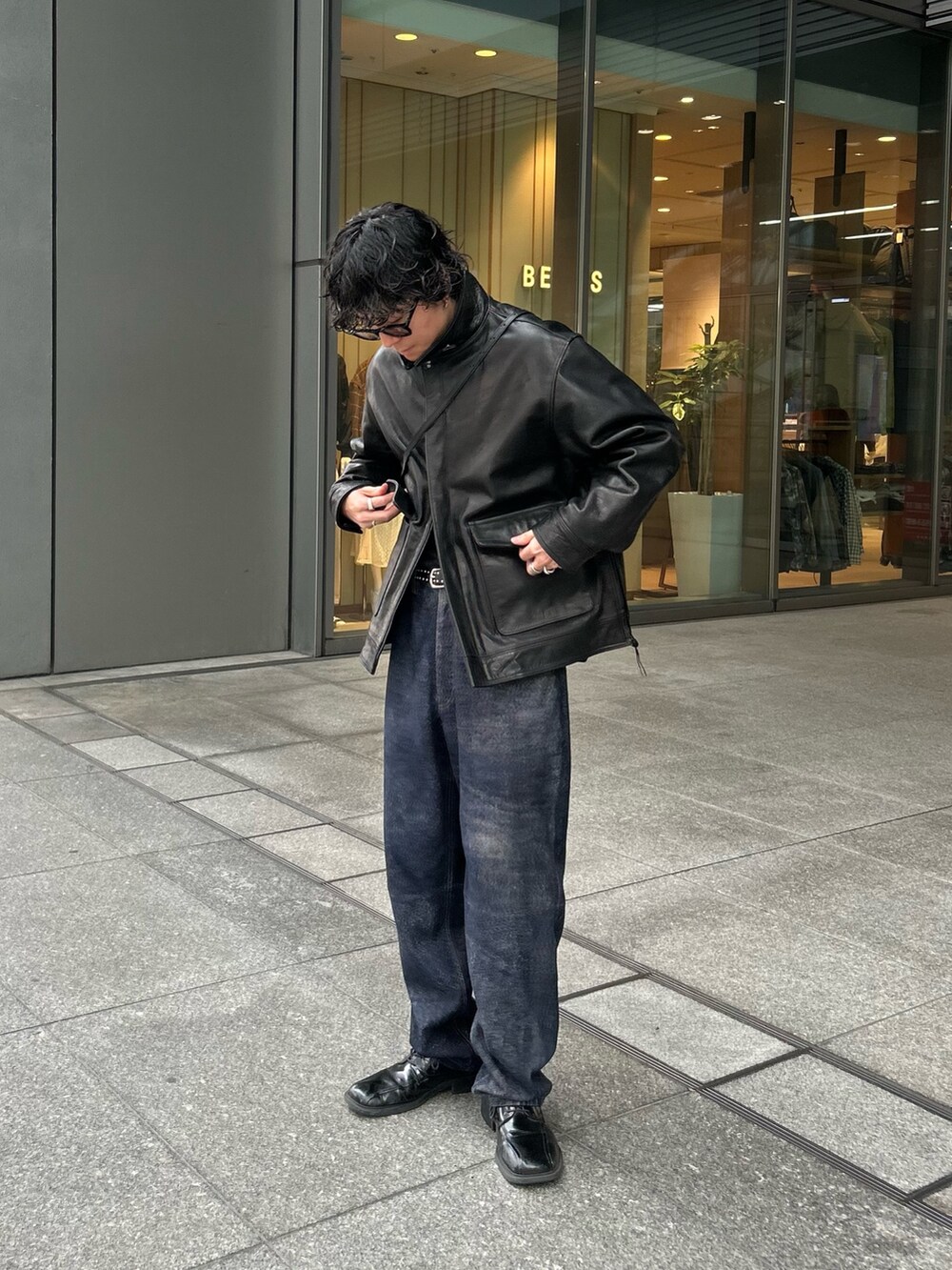 A2レザーにアンティーク加工のレザートラウザーを合わせたオールレザースタイリング。