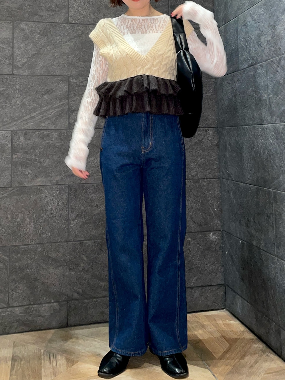 フレアパンツにショート丈のベストを合わせる事で、すらっと見えるので足長効果にもなります‼️