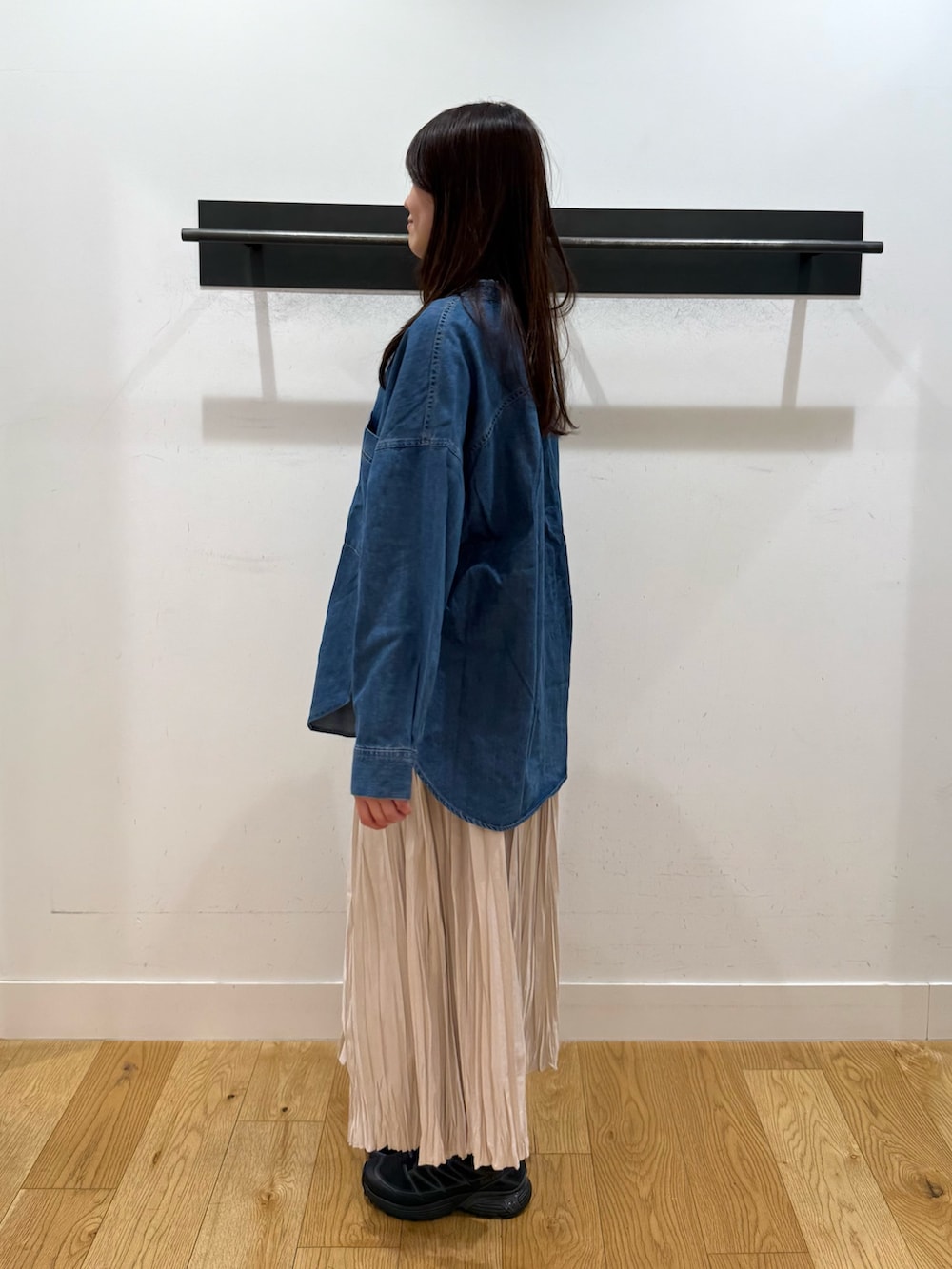 ゆったりとしたデニムシャツに、軽やかなプリーツスカートを合わせた春先取りコーデです🌷