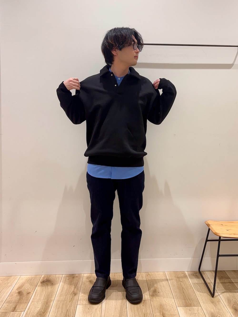 色を入れたくてスウェットPOLOのインナーにブルーのバンドカラーシャツを差し込みました!
