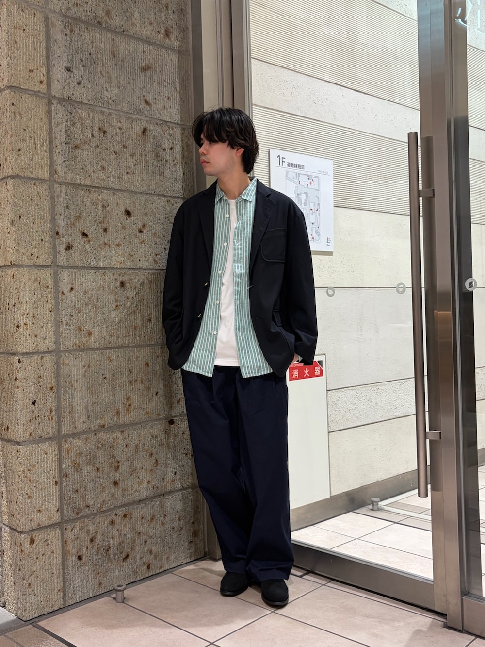 トップスはキレイ目ながらシャリっとしたパンツでやや外しも取り入れながら