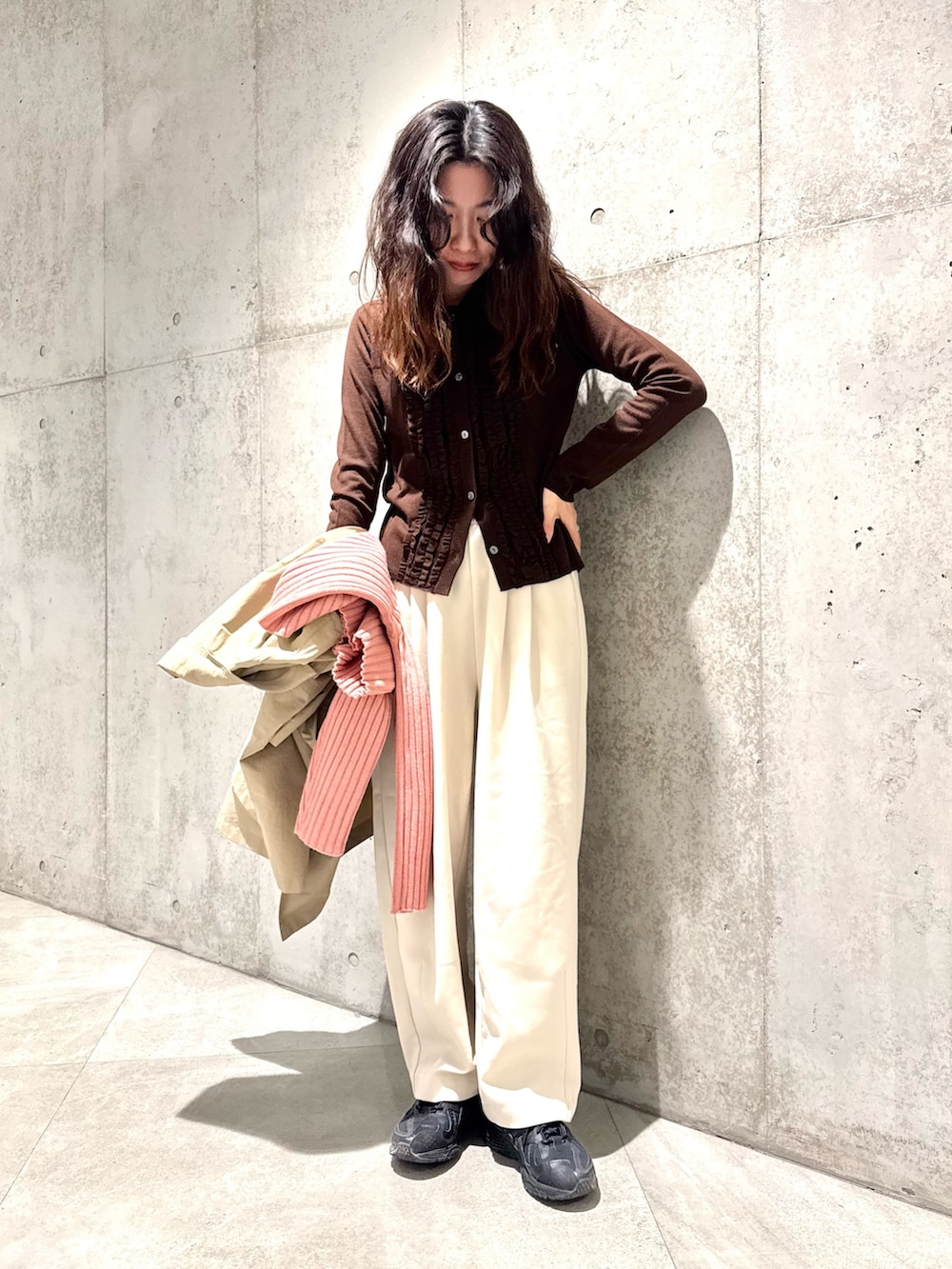 ブラウン×ピンクの甘めカラーも、ちょいメンズライクなバランスで大人でも着られます。