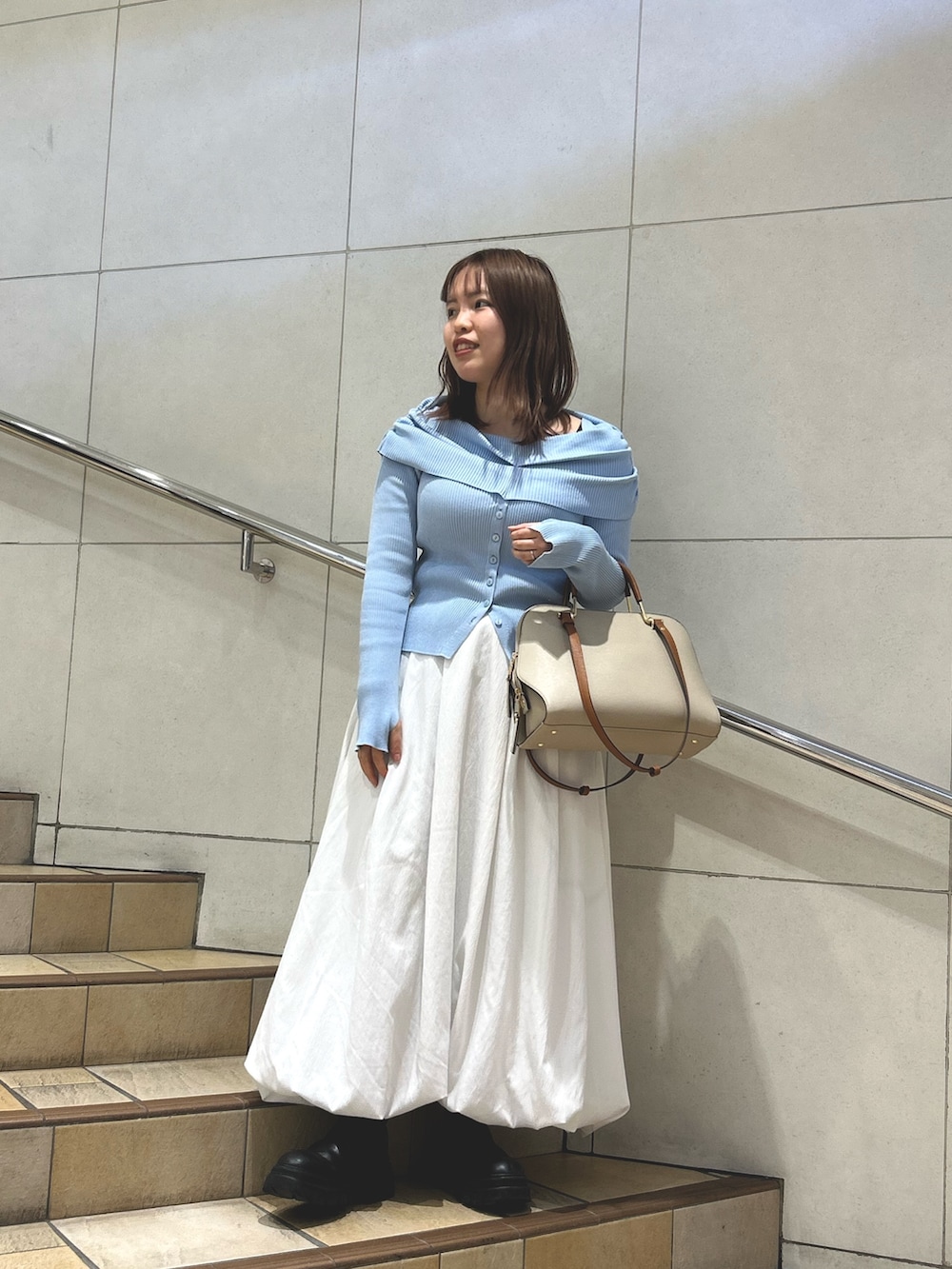 ベージュのバッグでやわらかさをプラスした、大人かわいいスタイルにしました♪
