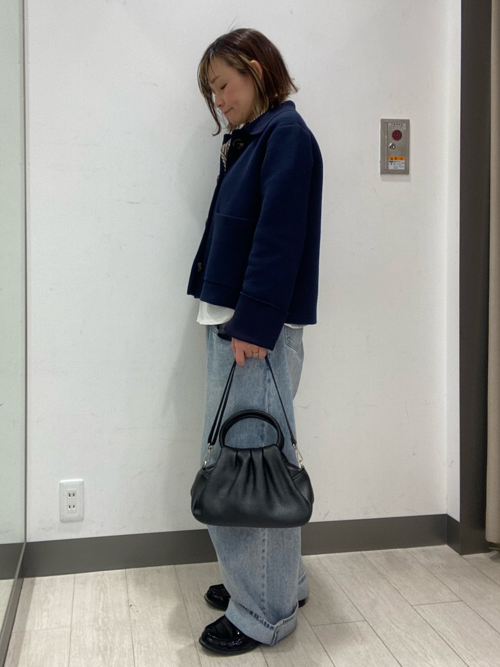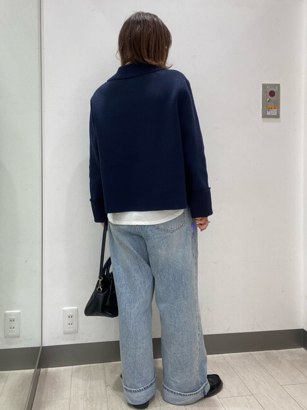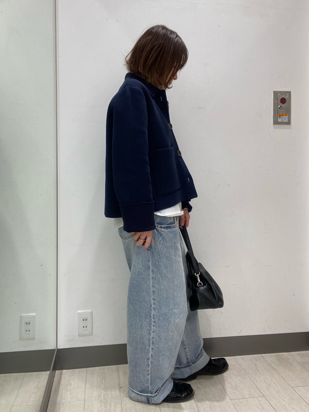 ニットジャケットは、ボタンとポケットが大きいのがポイントで、キレイめに着られます。