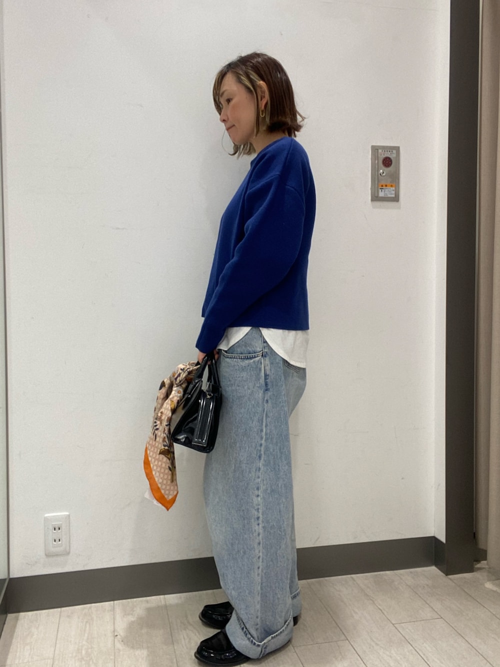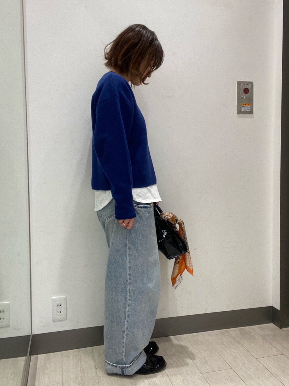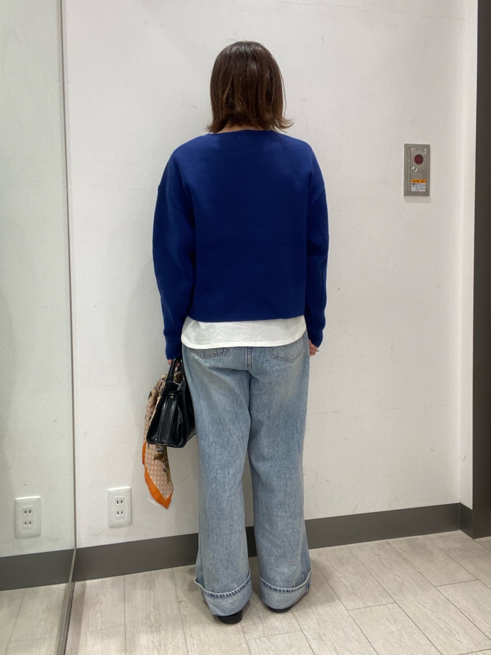 ニットは鮮やかなブルーで、ショート丈なのでインナーを見せて爽やかな印象に。