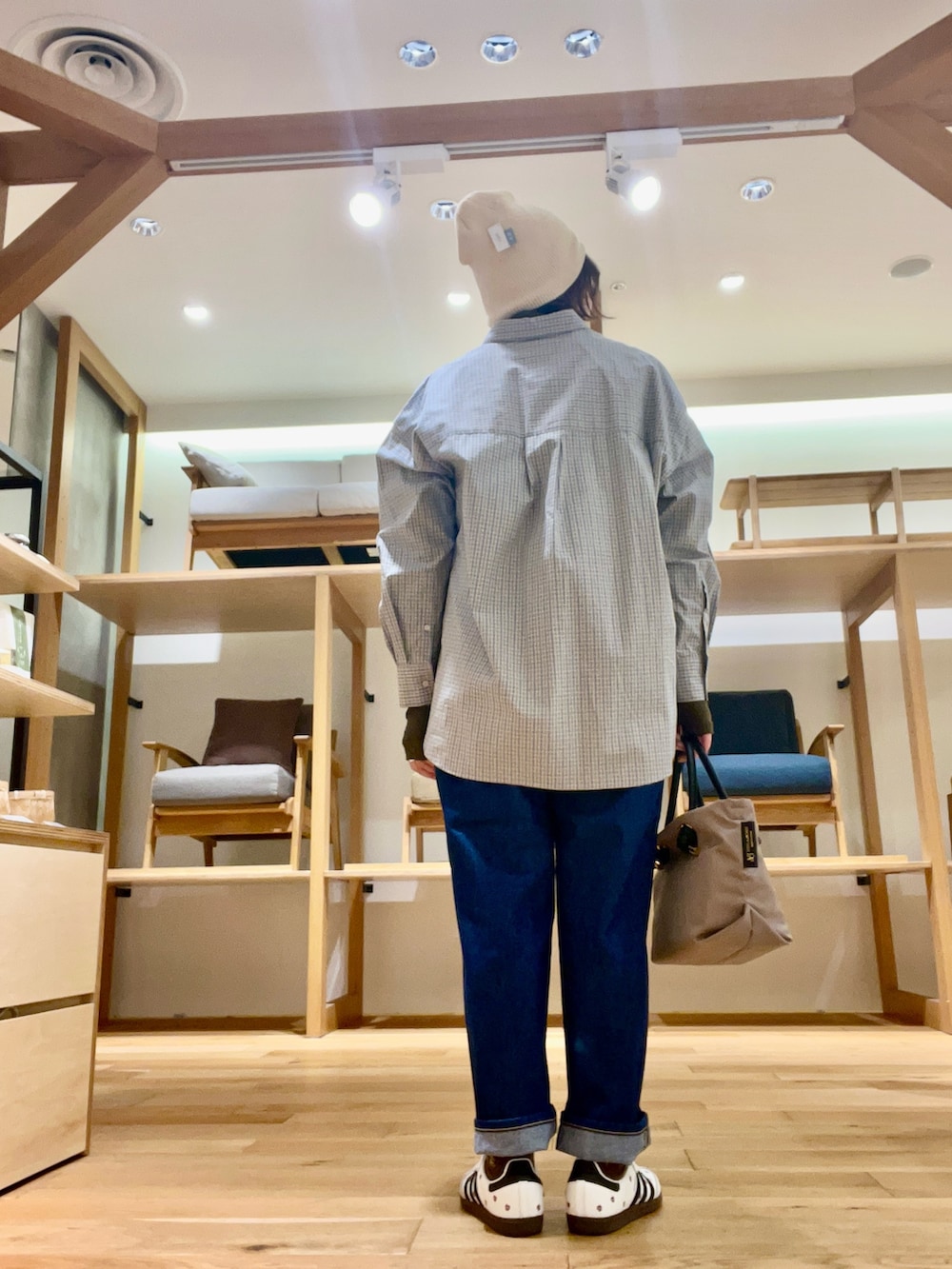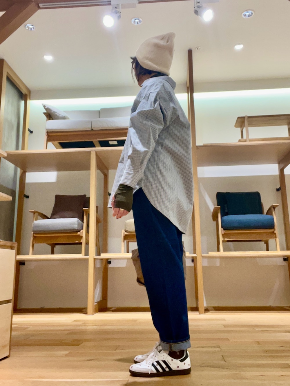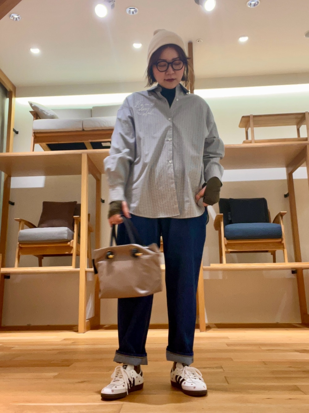 ロールアップをしスニーカーをポイントにしました‼︎ラフな装いに、メガネ×ニットビーニーをあわせました‼︎
