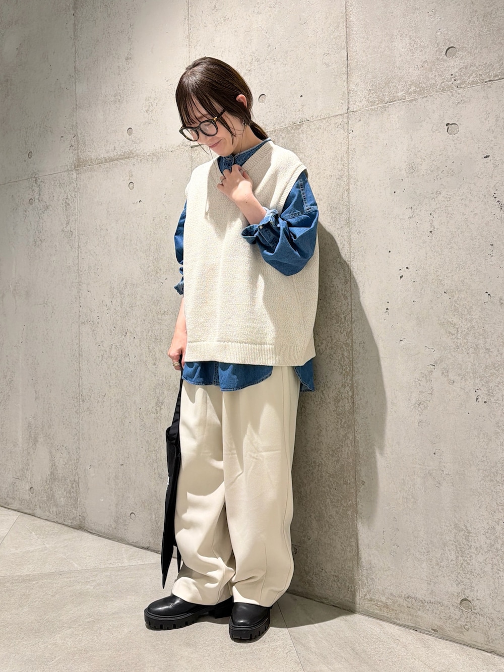今回は、デニムのシャツを合わせて、春までお使いいただけるコーディネートです。
